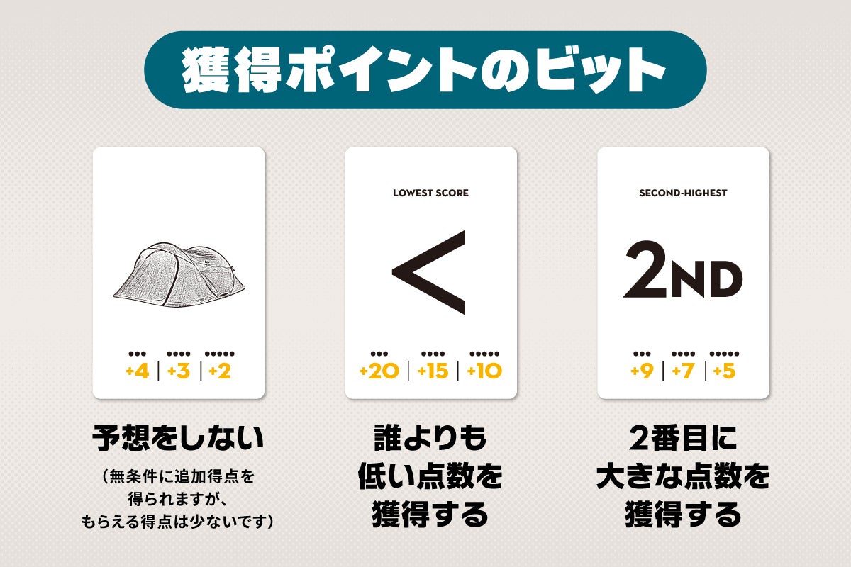 その得点が、先ほどのビットカードと一致していたら(あるいは「予想しない」カードを出していたら)追加得点を得ることができます。