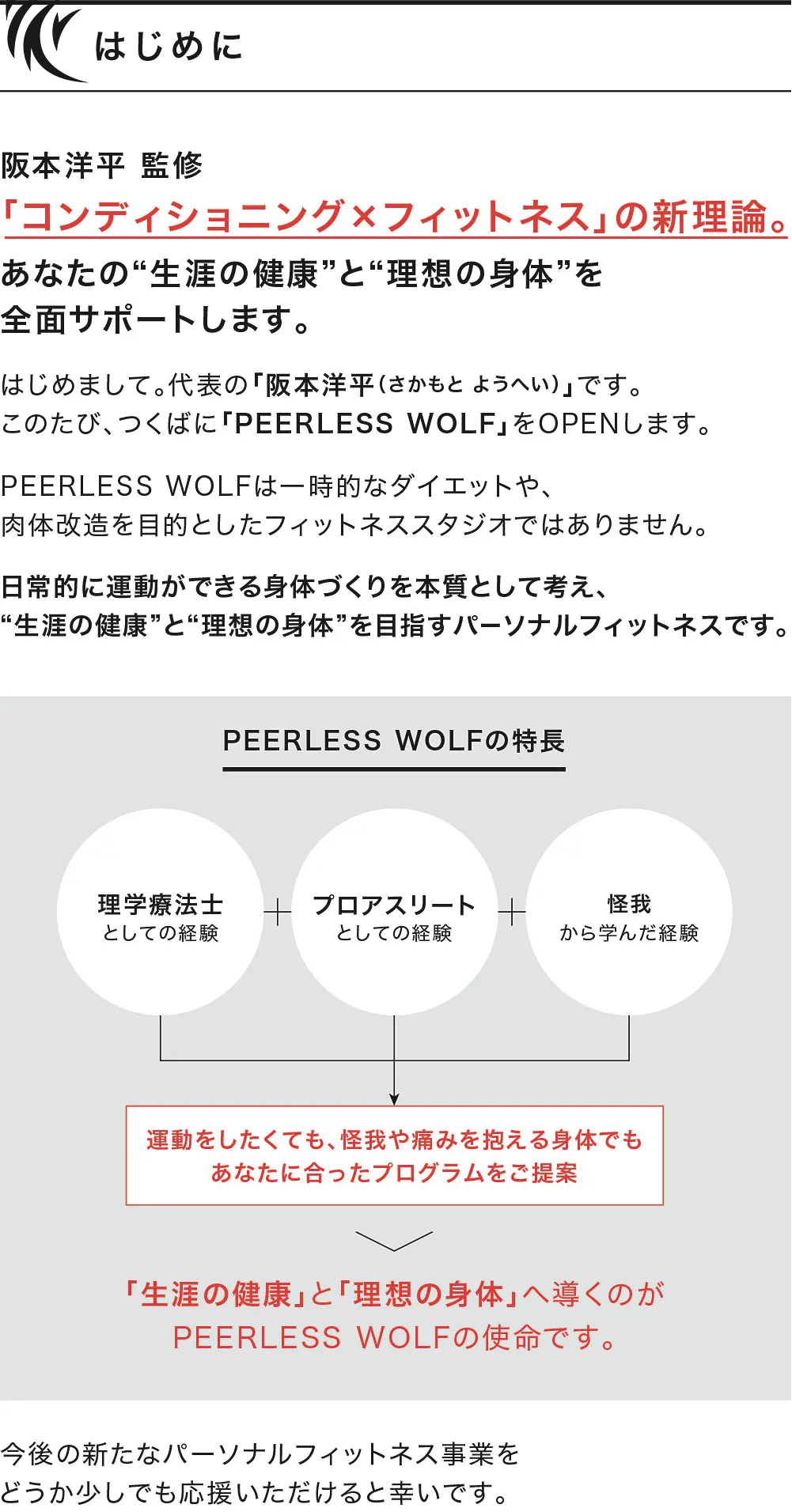 「理学療法士として得たキャリア」と「プロアスリート」としての全ての財産を、今度は「PEERLESS WOLF」という形でみなさまの「身体の健康と人の幸せ」「格闘技と人の内面の変革」に注ぐためにスタジオを設立する決意をしました。