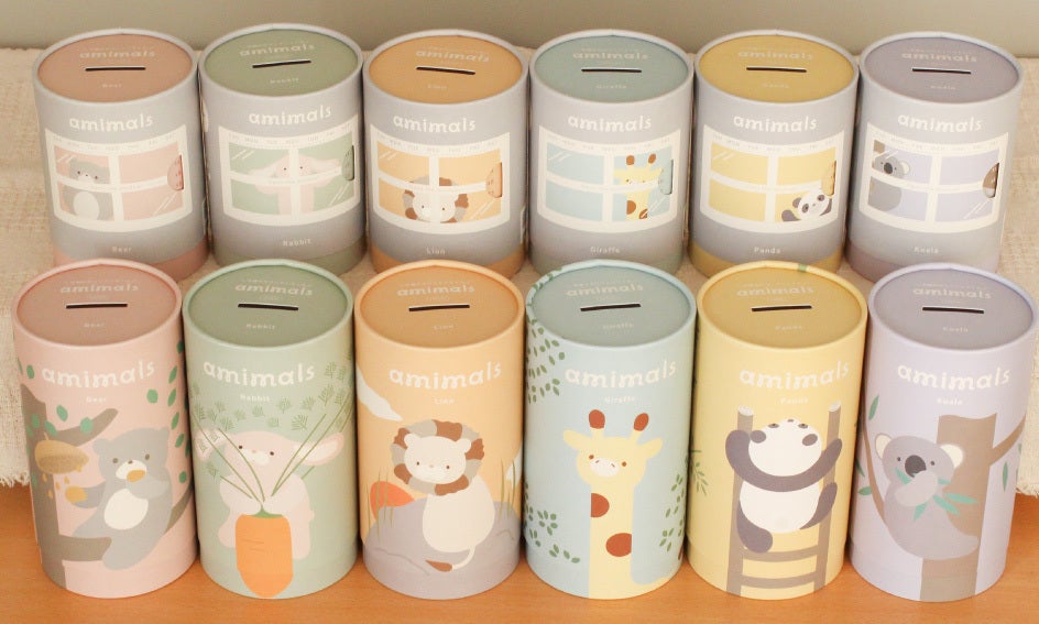 「amimals ラトル」のパッケージは、内側の容器と外側の蓋のデザインが繋がる仕組みになっています。蓋を上げるにつれてどんどん絵が伸びる仕掛けが施されているため、開けたり閉めたりすることで絵が変わるおもちゃになります。蓋には貯金箱としてもご使用いただける穴が開いており、さらに 「amimals マスコット」のパッケージには、蓋に開けられた窓を切り取り線に沿って切り離すと、1年中使える仕様のカレンダーが。パッケージ上部の蓋を外すとペン立てとしてもご使用いただけます。 出産のギフトやお誕生日のプレゼントにも素敵なパッケージ付きのリターンです。