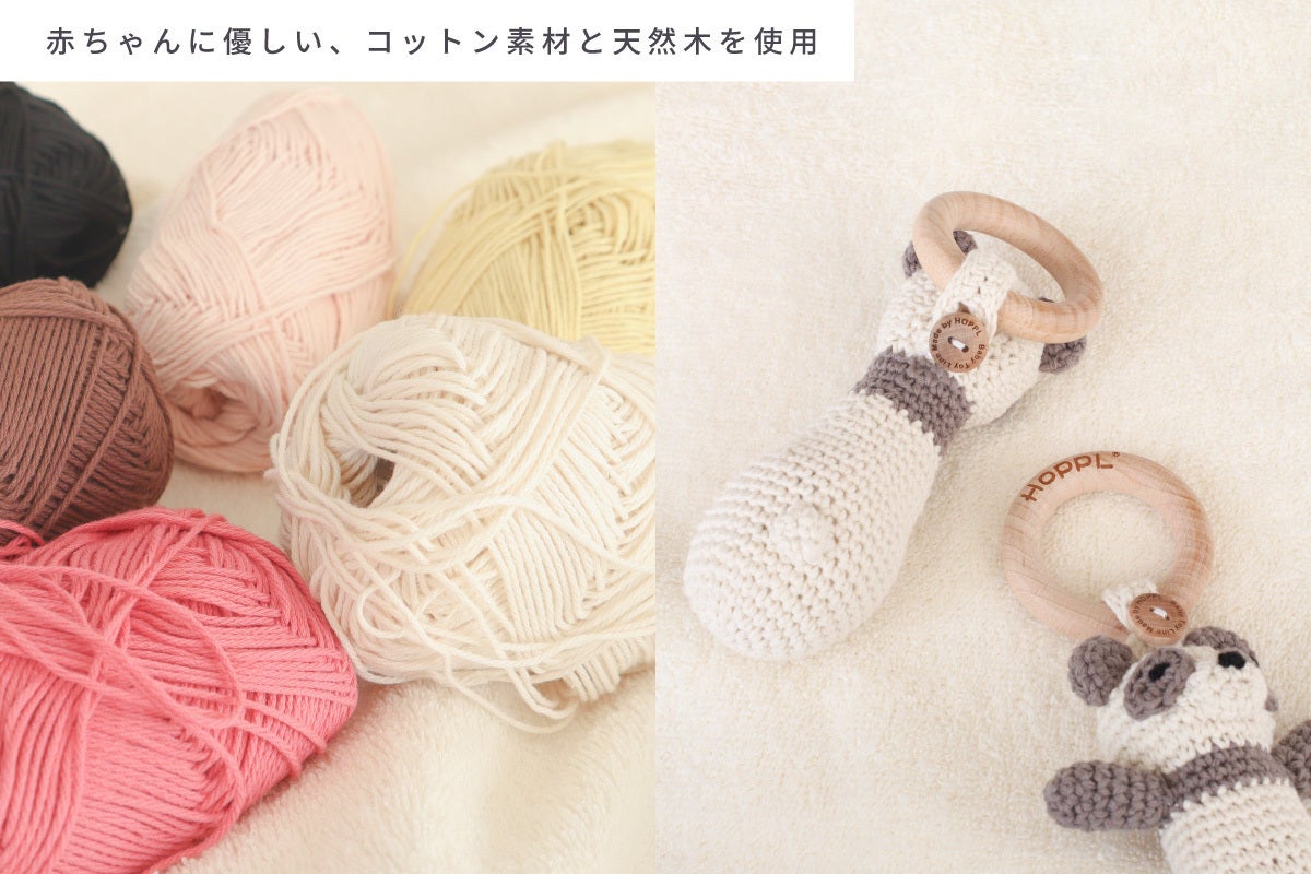 「HOPPL」のものづくりは、生産者の女性たちによる沢山の工夫とこだわりが詰まっています。何度も改良を重ねて、ユーザーとなるママと赤ちゃんの意見を取り入れながら生まれた「amimals(アミマルズ)」のコットンラトルには、完全国内生産だからこそ実現できる生産者の思いが込められた、ぬくもりを感じる、次世代の子どもたちに送りたい心温まるプレゼントのような逸品です。