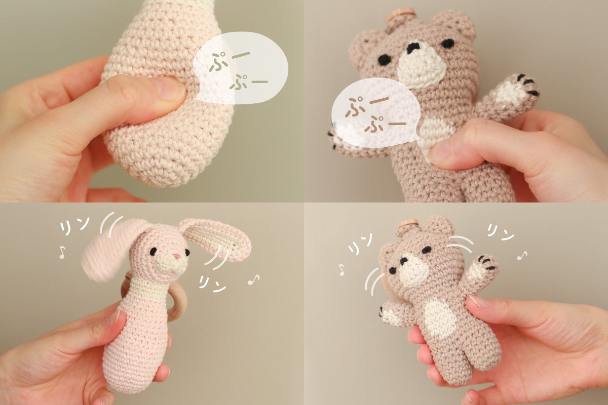 中に鈴と鳴き笛が入ったamimalsは、振ったり握ったりすると可愛らしい音が鳴ります。動物たちの頭の部分には優しい音色の鈴が、おなかの部分には赤ちゃんの興味をそそる鳴き笛が、お出かけ中や寝かしつけ時に赤ちゃんを優しくあやすことができる、ママ、パパのお助けアイテムです