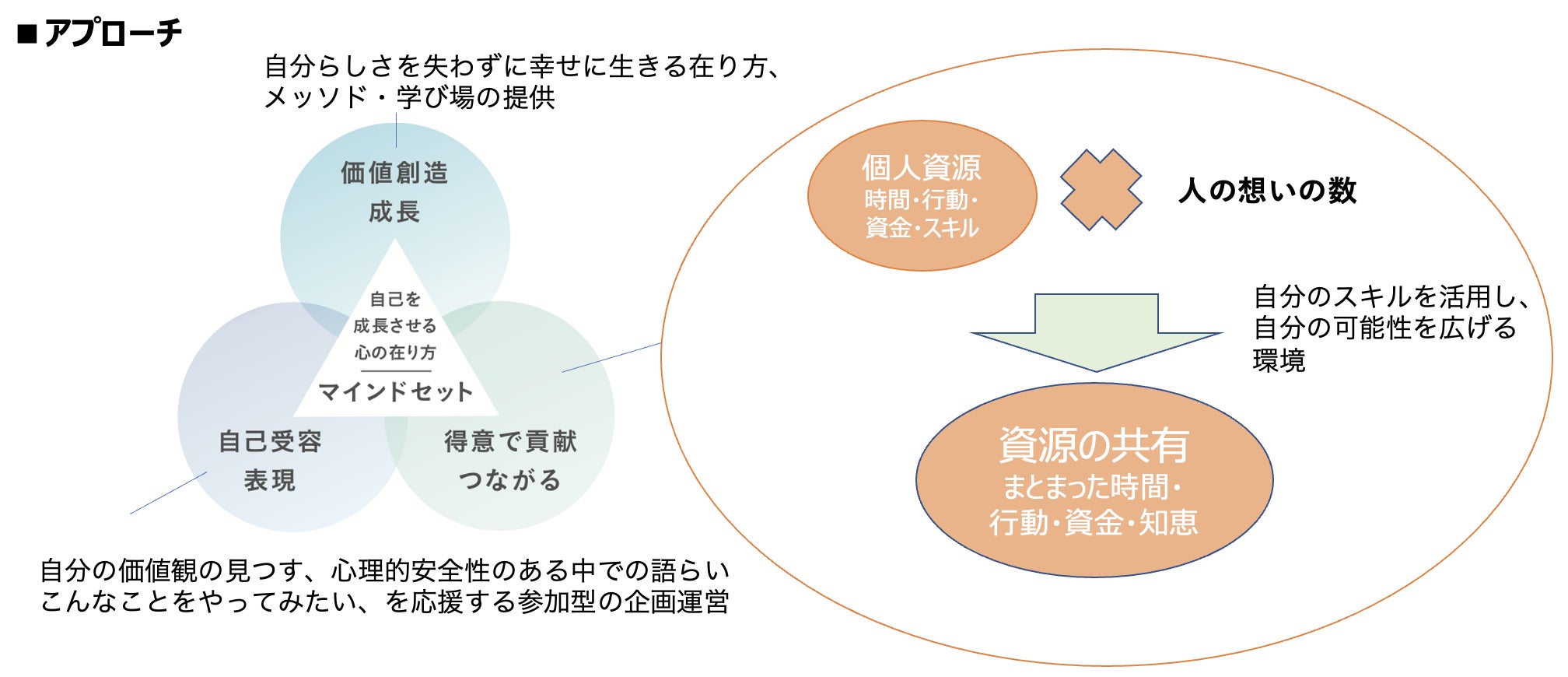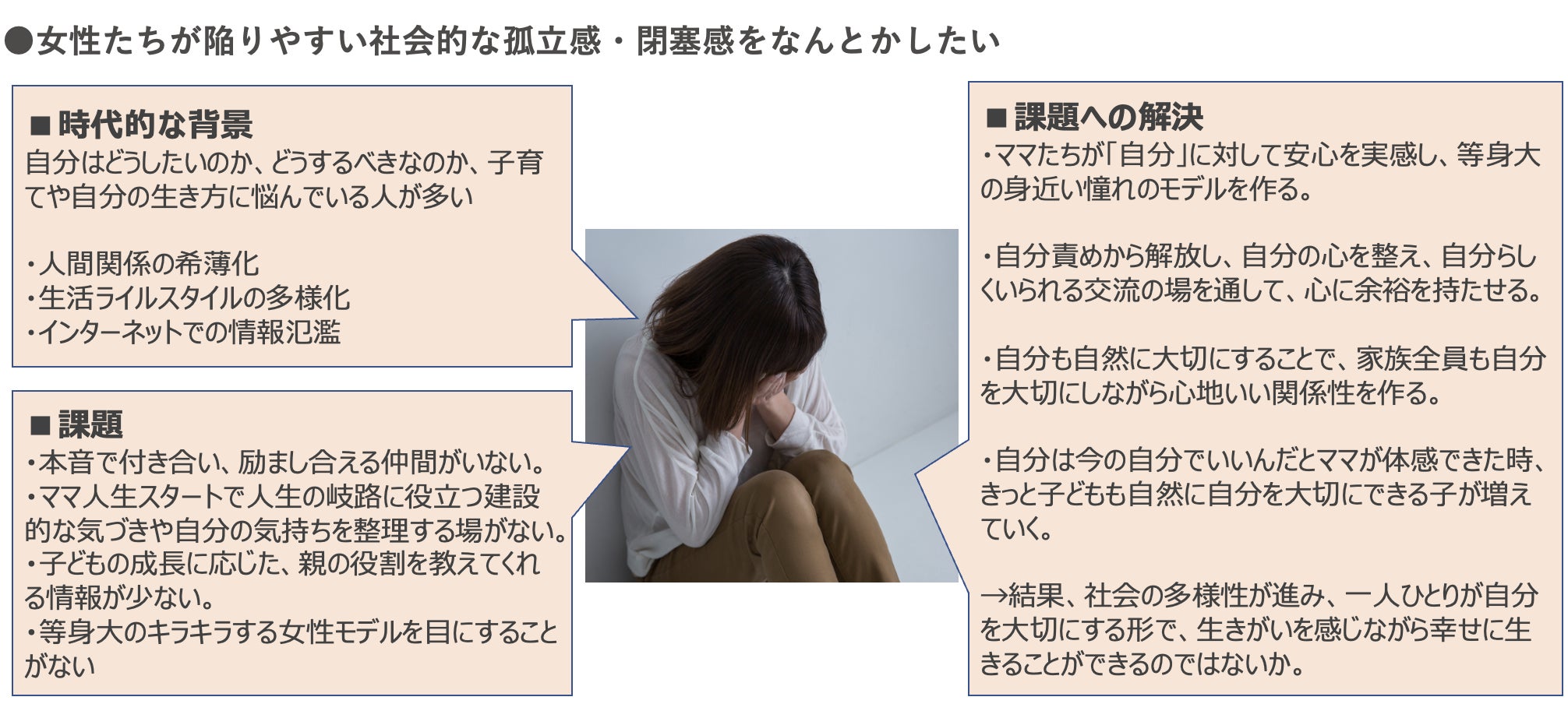 ・閉塞感を感じやすい日本の女性が置かれている環境の中で、孤独で奮闘する育児ママの精神的開放や安心の場を提供することはもとより、悩める育児ママや育後ママを代表とする女性たちのライフステージの変化に合わせて、気持ちを整理するサポートや教育、啓発活動を通して、自己肯定や、自己受容やありのままの幸せを感じられるようなコミュニティーを目指します。