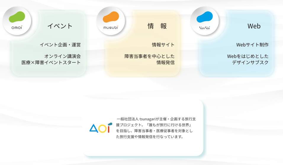 AOiは「行きたい場所に行けない」を「行ける」に叶える、医療従事者と障がい当事者が一緒に行きたい場所に行くイベントを行う新規事業です。障がい当事者の「行けない」を、専門家の同行・サポートにより「行ける」に変える。そして、ひととひとのつながりを感じる体験を、参加者全員で創る。企画立案から運営を行うメンバーには障がい当事者の方も所属しています。今後も、新たなつながりを感じられるイベントを考えています。
