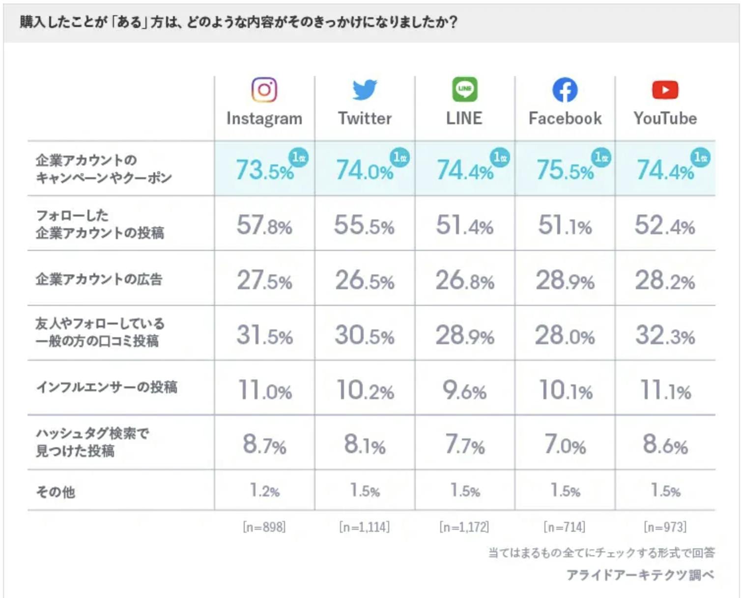 参考:アライドアーキテクツ株式会社【2020年最新版】5大SNSユーザーによる「SNSをきっかけとした購買行動・口コミ行動調査結果」公開!(Twitter、Instagram、Facebook、LINE、YouTube)