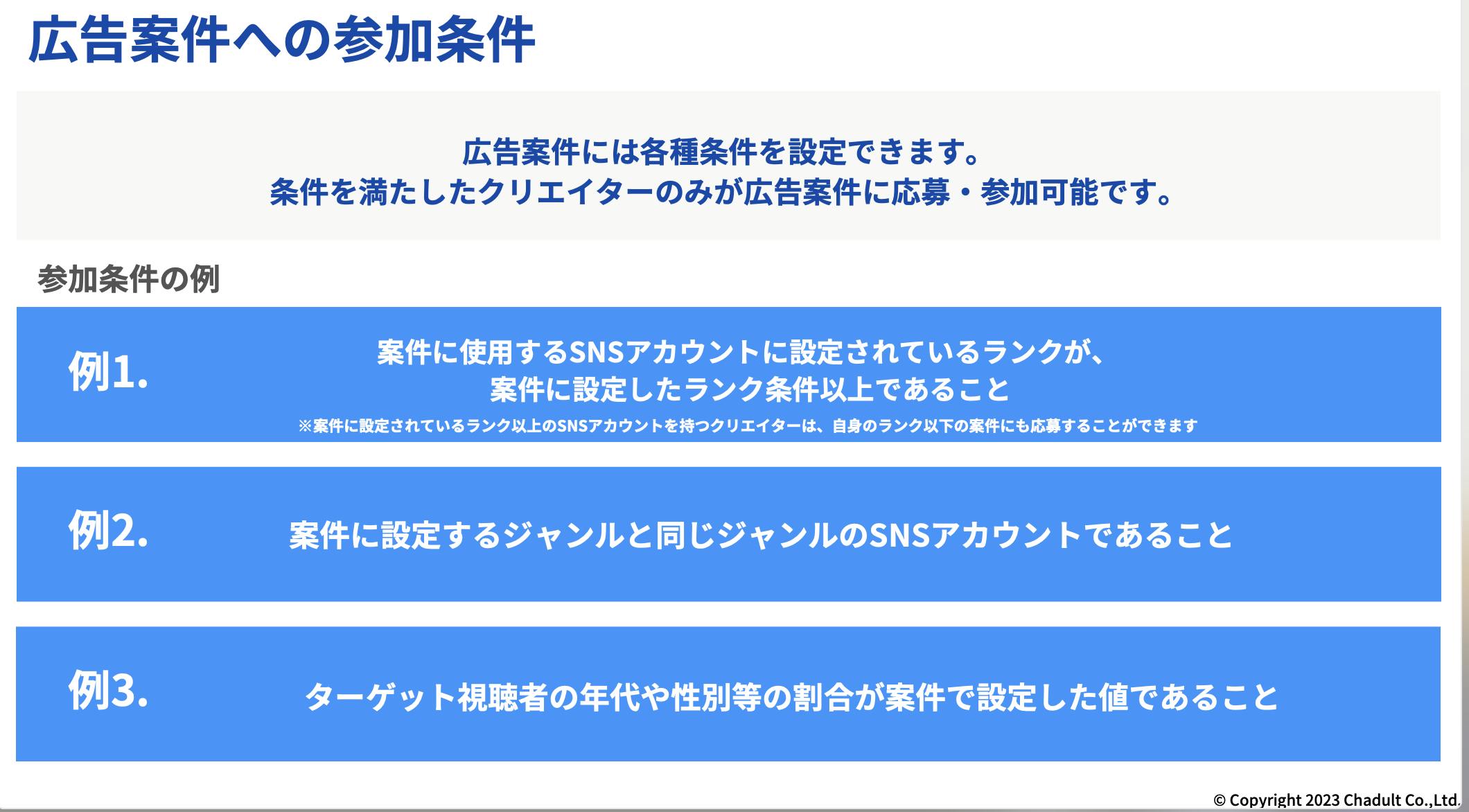 また掲載するPR案件には様々な条件設定で応募可能なクリエイターを制限することができ、貴社商材のターゲット層に簡単にリーチができる仕様となっております。