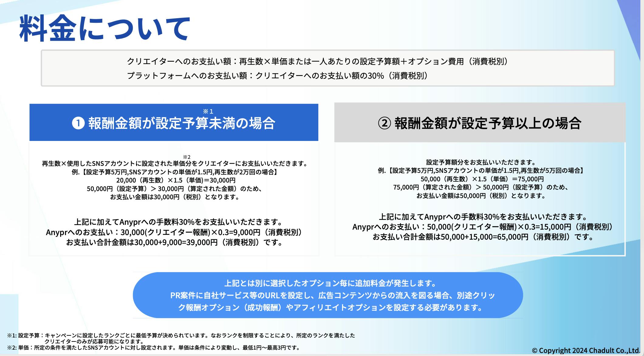 これらに加え、アフィリエイトプランなどのオプション機能もあり、目的に合わせて柔軟にPR活動が可能となっております。なお広告主様は、クリエイターへの報酬金額の30%をAnyprへの手数料としてお支払いいただきます。