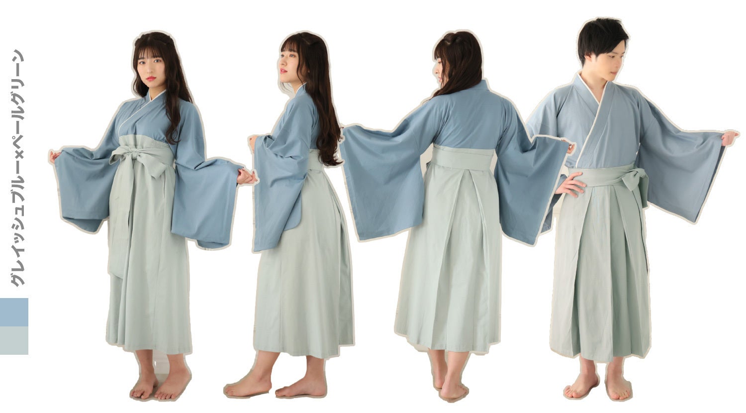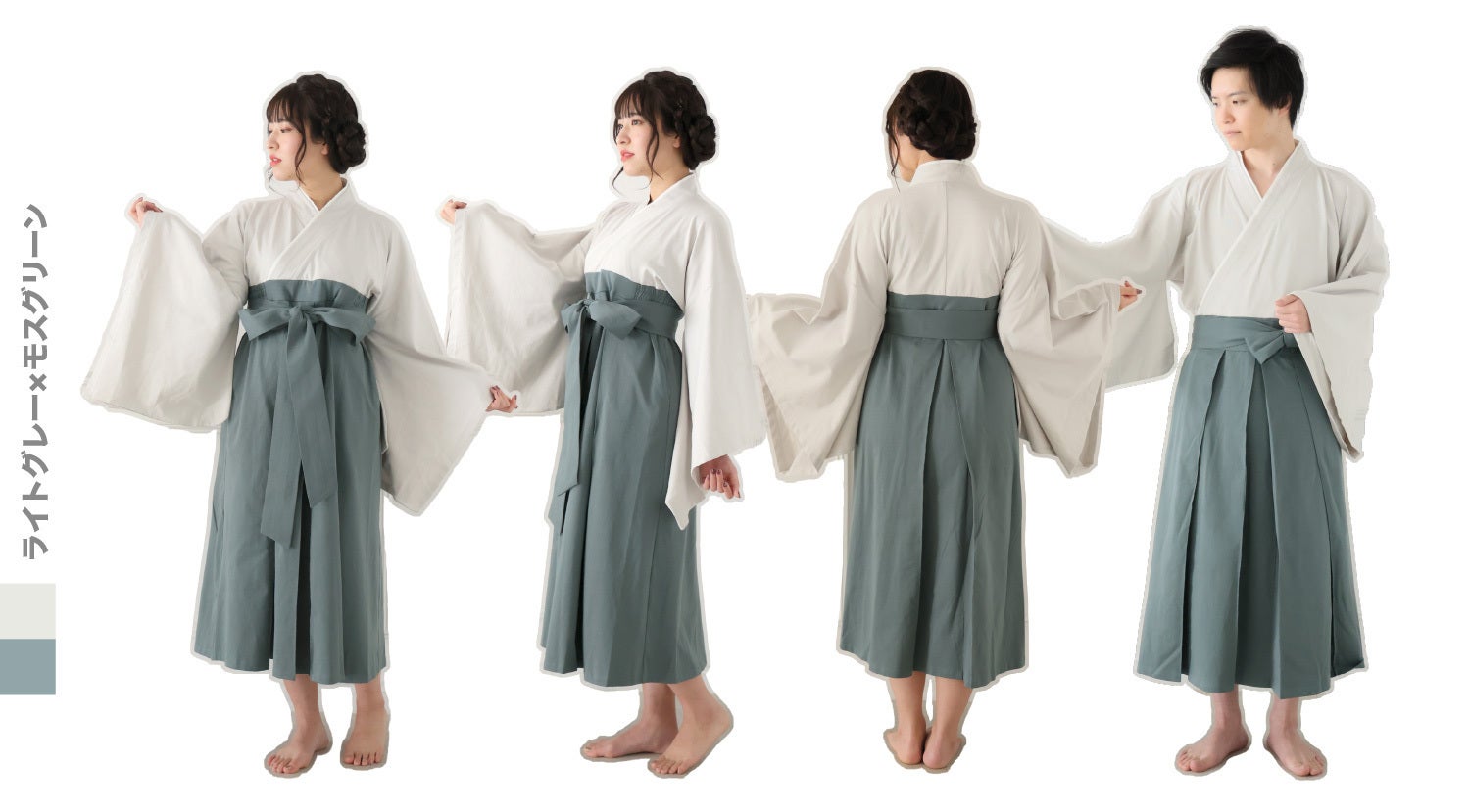 薄手で軽くなりましたが透けずにご着用いただけますので、夏祭りに着ていく選択肢としてゆる袴があっても素敵です。また、第1弾とは違ったシンプルな無地での3色展開で、どのカラーもくすみがかった落ち着いた色合いなので男女ともにお楽しみいただけます。