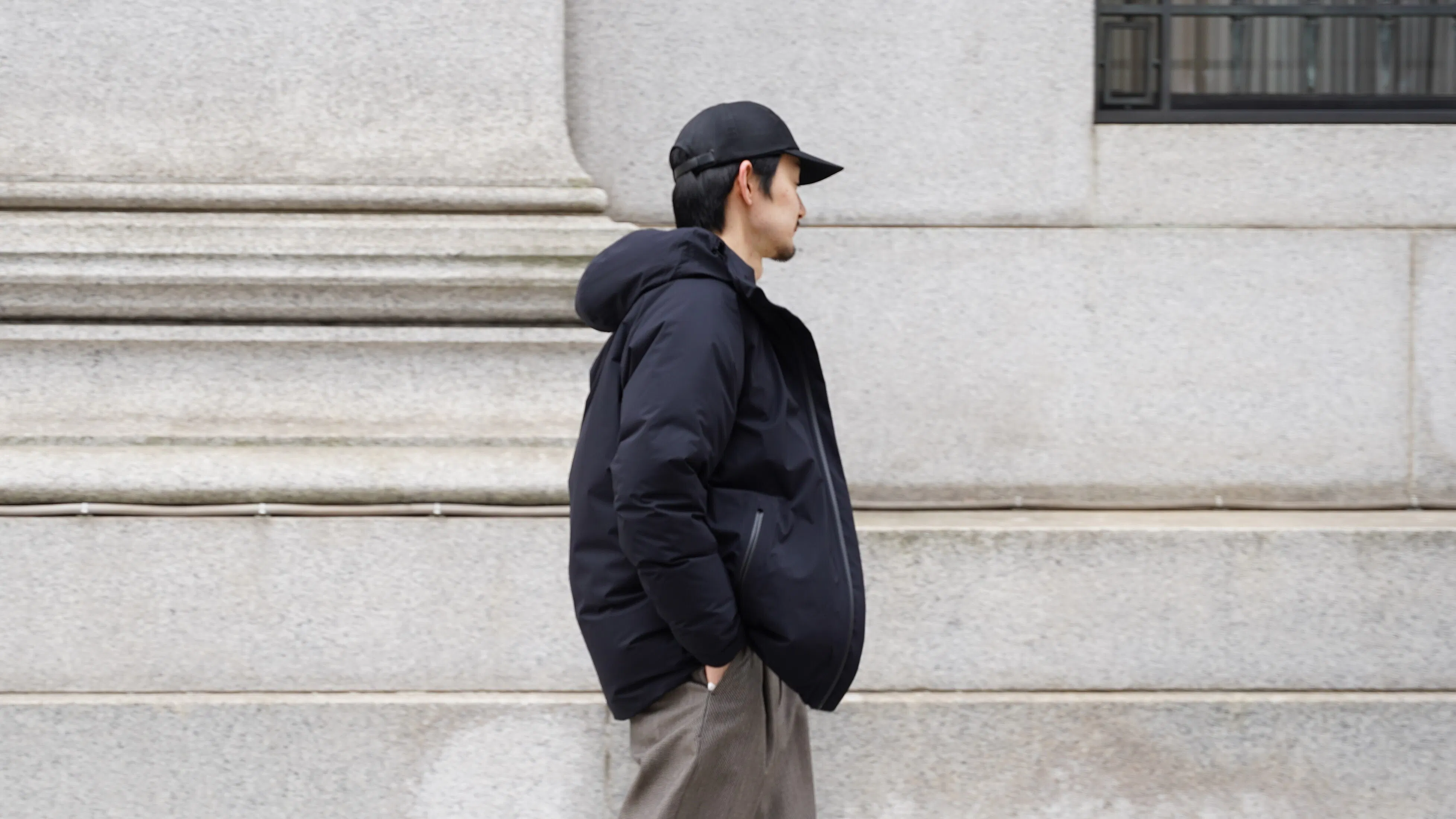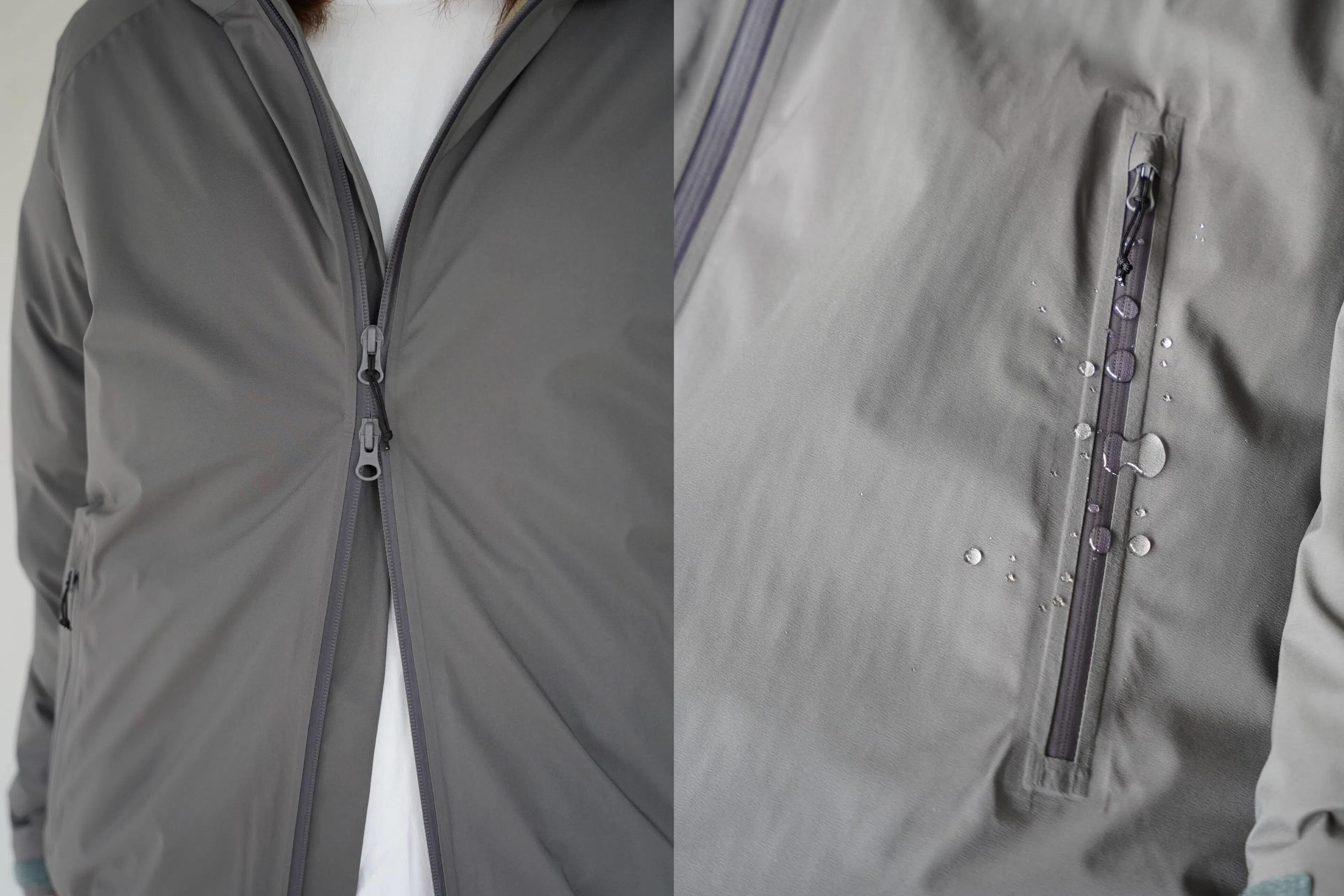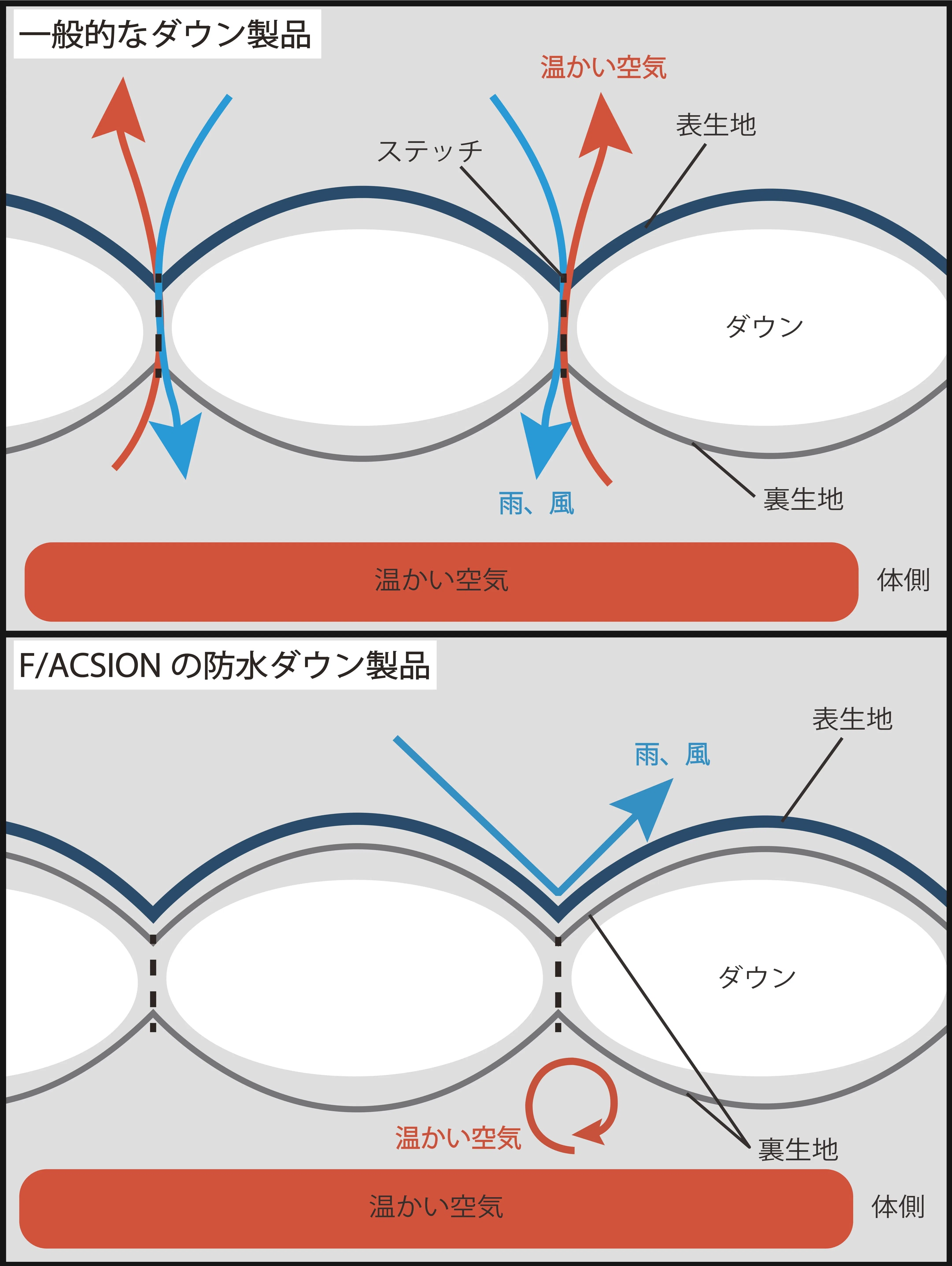 今回はダウンウェア用という事で通常F/ACSIONのレインウェアに使用している3層構造の素材を、軽さとストレッチ性を重視し特別に専用の2層構造素材を使用しています。
