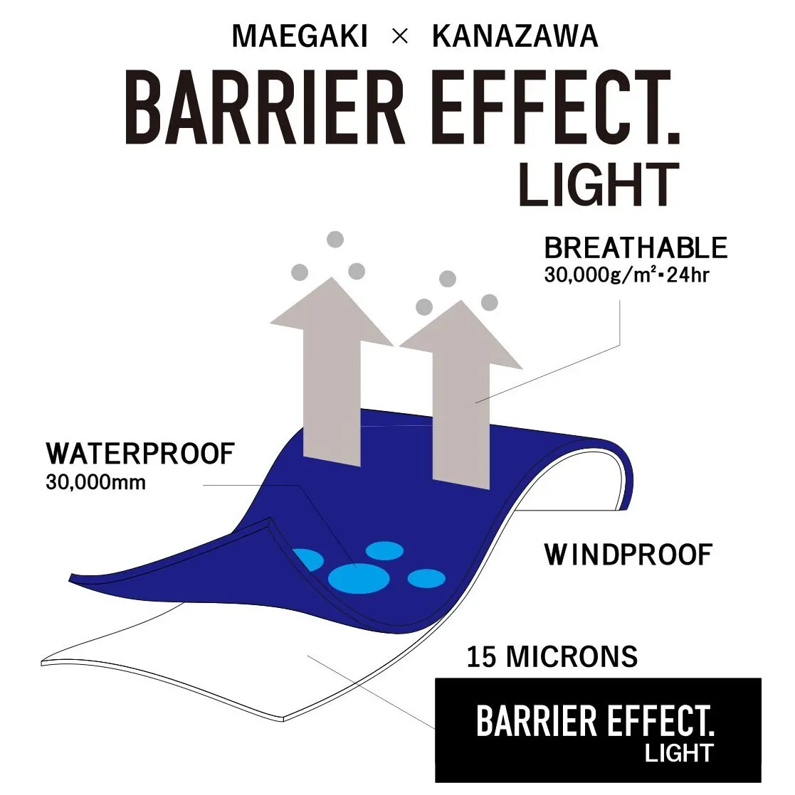 限りなく薄く延ばされた防水透湿膜はわずか15ミクロンの極薄メンブレンを使用、豪雨に耐える高い耐水圧30,000mm以上※¹を有し、同時に内側の湿気を外側に排出する優れた透湿性30,000g/㎡/24hr以上※²と、最先端の高機能レインウェアにも匹敵するスペックを備えています。