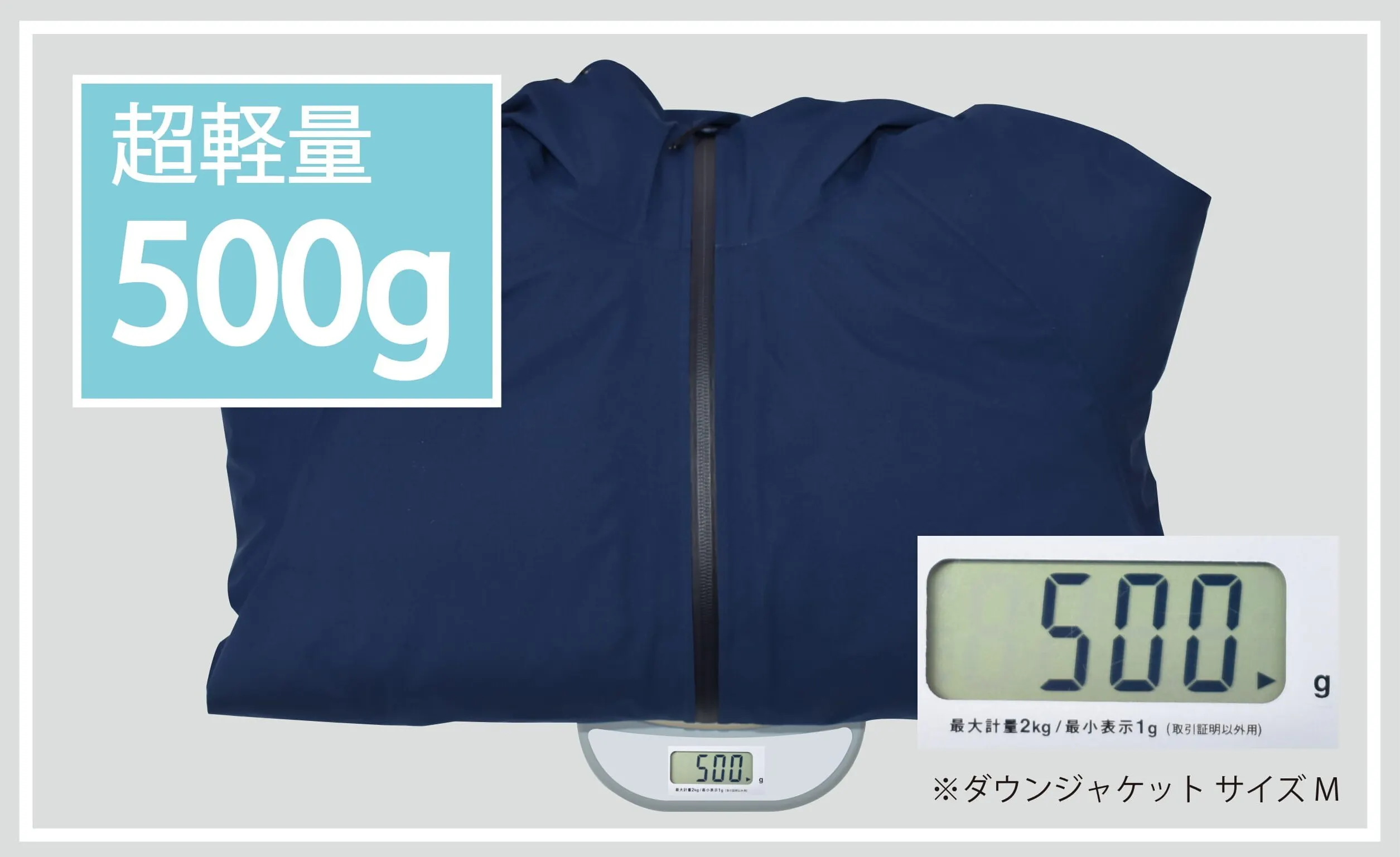 Mサイズのダウンジャケットで約500gと防水ダウンジャケットとしては驚くほど軽量かつ、しなやかで着用時のストレスを大きく軽減してくれます。