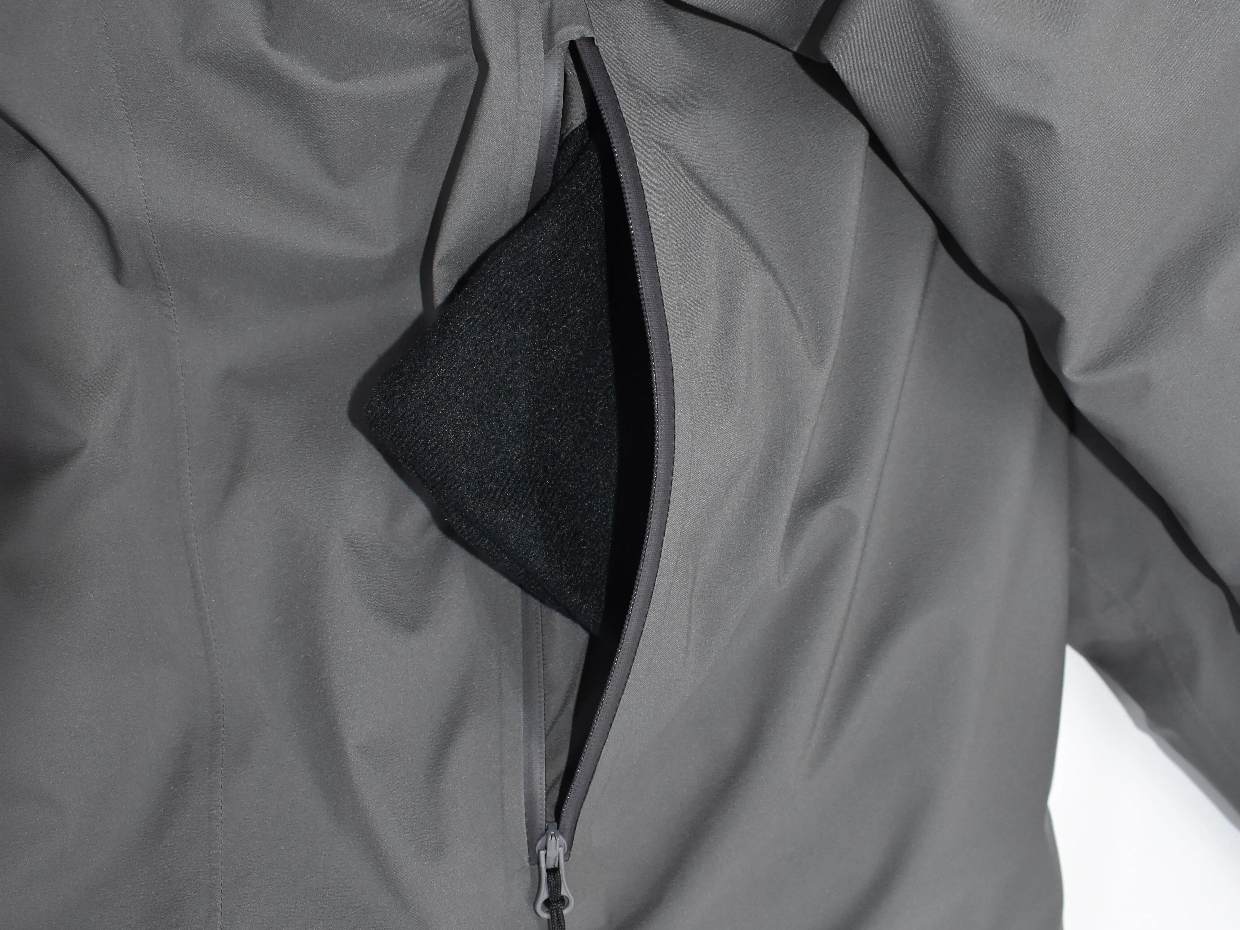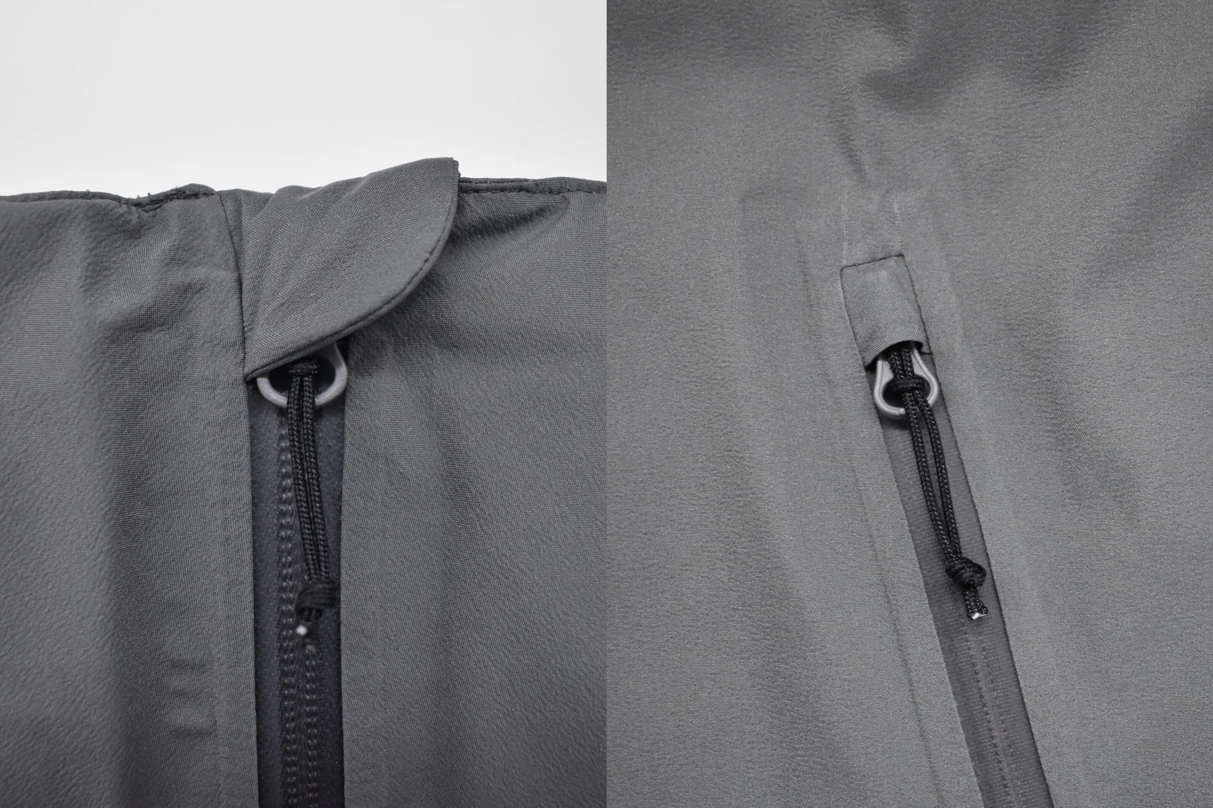 また、フロントファスナー上部にはファスナーのスライダーが直接顎に当たらないよう保護するカバー (チンガード) と、ファスナーと生地との隙間から水が入りにくいようにスライダーガレージを取り付けています。