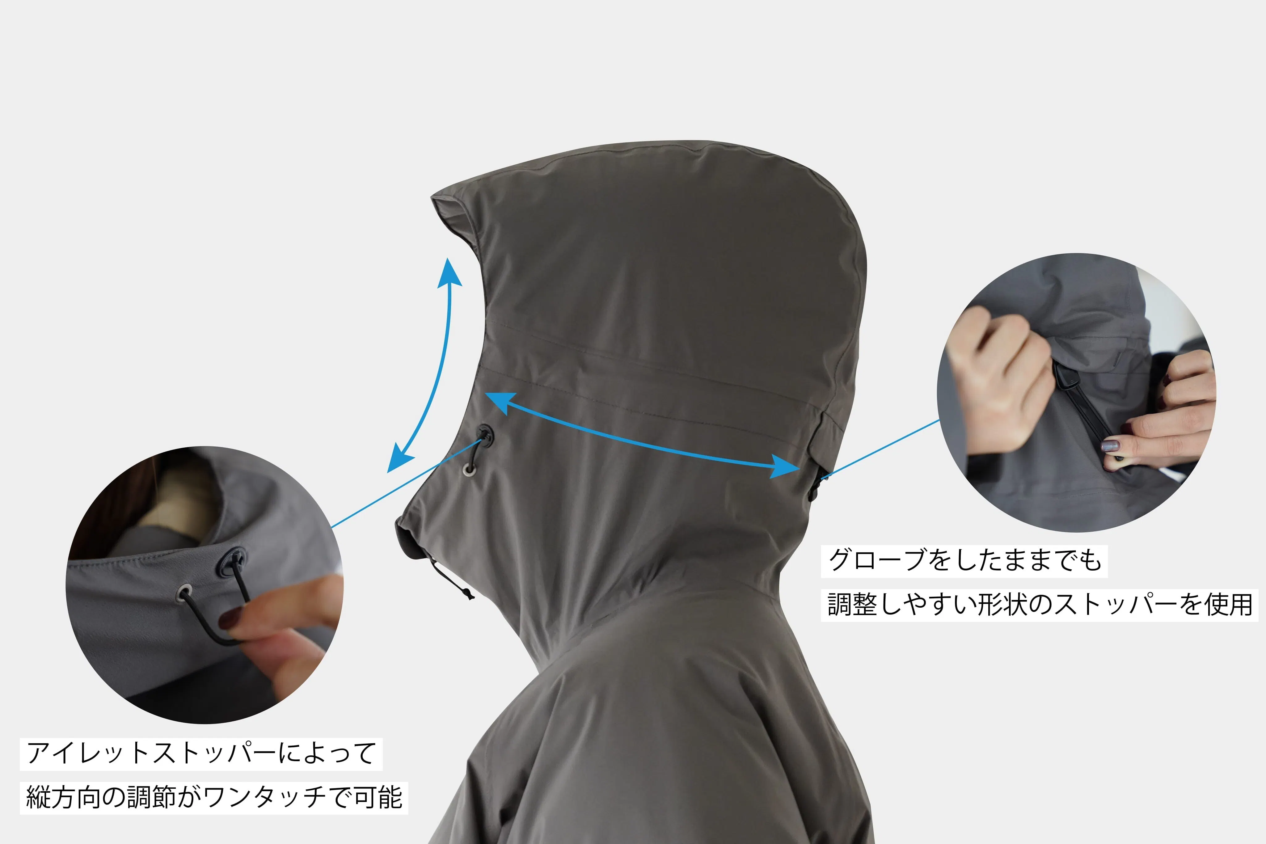 フードは縦横ワンタッチで調整可能なストッパーが付いていて、頭にフィットする事が出来て、雨や雪、風などの侵入を防ぐ事が可能です。