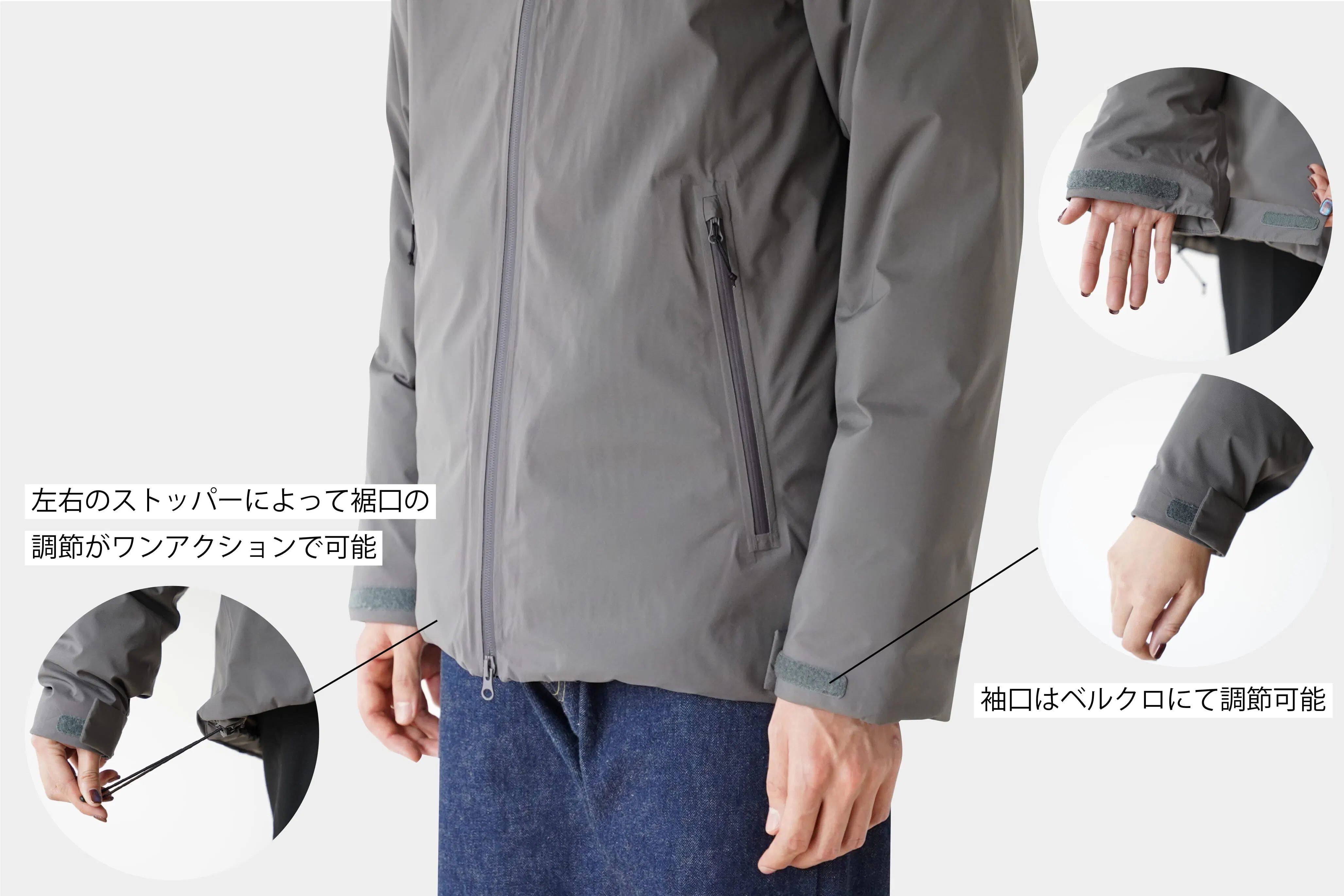 袖口はベルクロで調節、裾口は左右のストッパーにより調節する事により雨風の侵入を防ぐ事が出来ます。