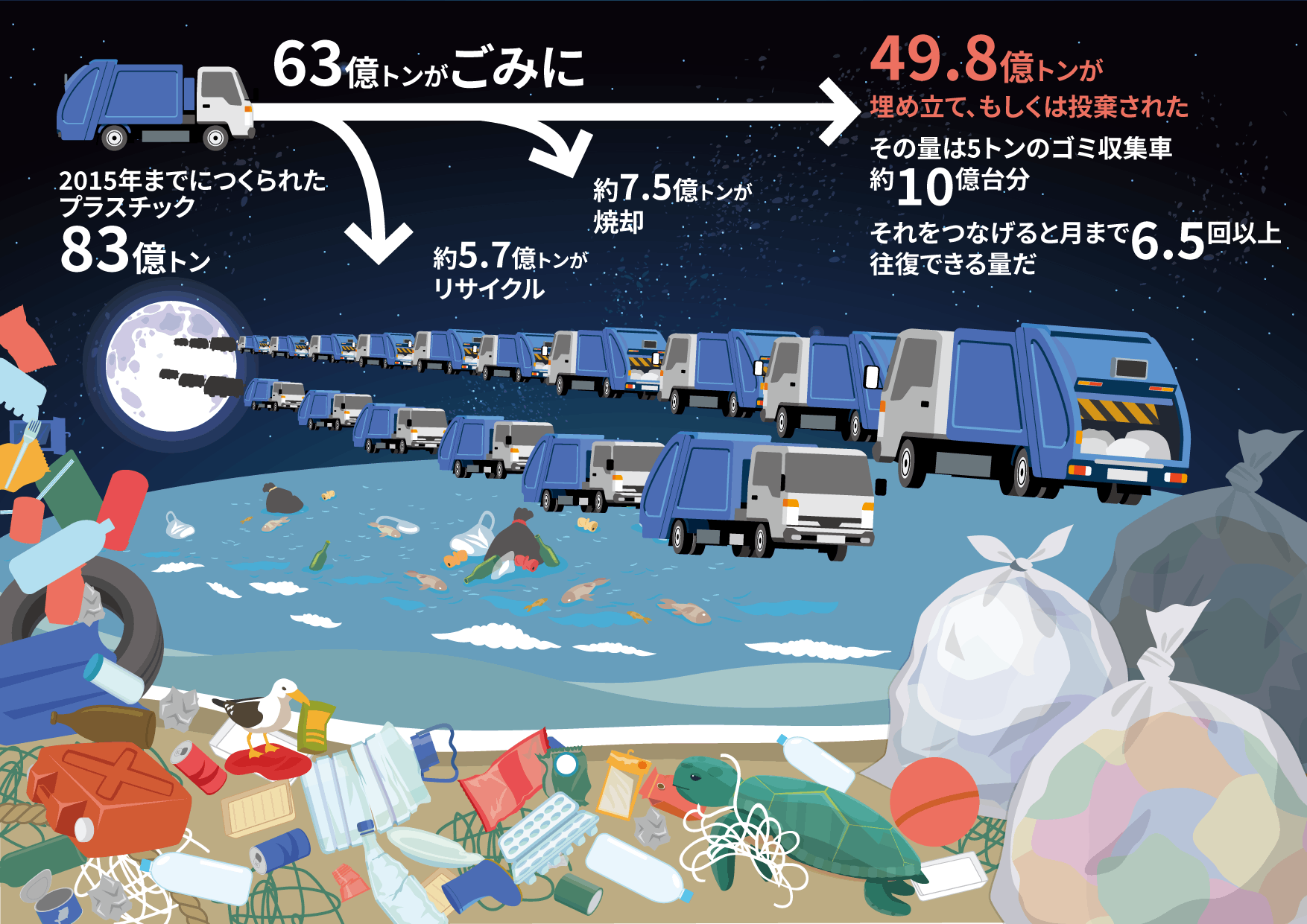 2017年でのアメリカの研究チームの発表した内容によりますと、2015年までにつくられたプラスチック83億トンの内、63億トンがゴミに、さらに49.8億トンが埋め立て、もしくは廃棄されています。5トンのトラックで想定すると、10億台分となり、繋げていくと月まで6.5回以上往復できる量になります。あくまでこれはコロナ前の2017年の研究データであり、コロナにより使い捨てのライフスタイルに変わりつつある今は、更に増えていることが容易に想像できます。