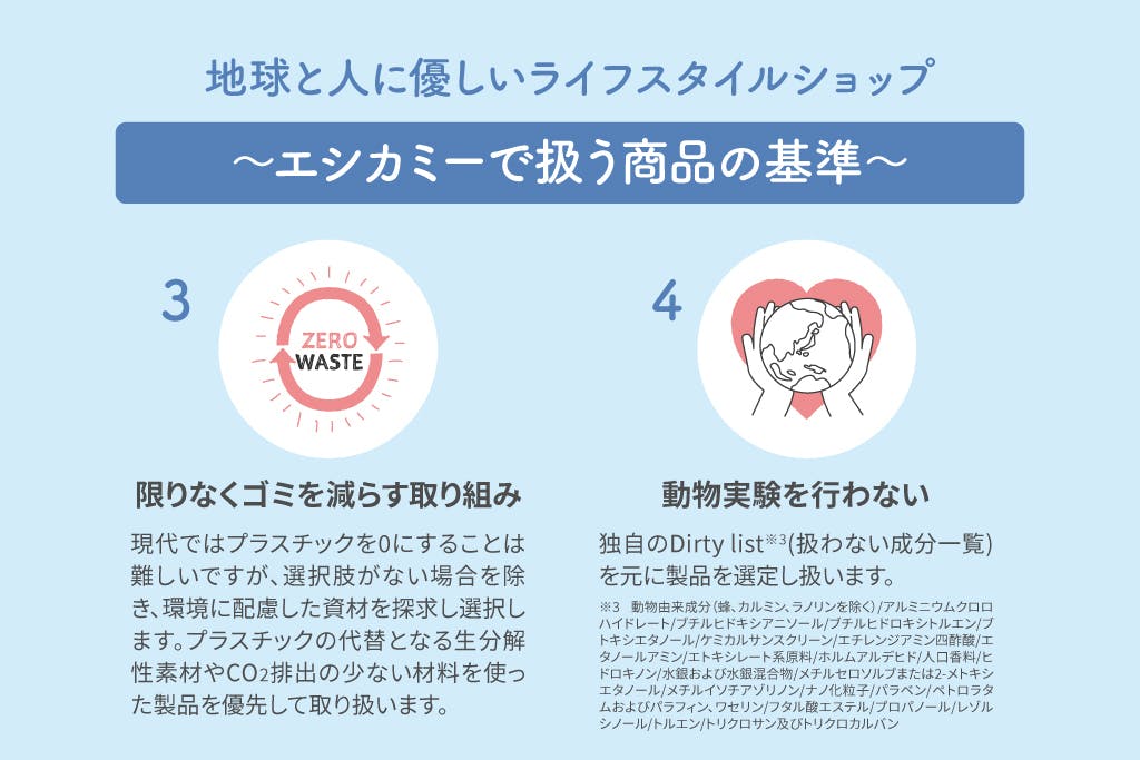 ethicameで取り扱う製品は、私たちの基準「The ethicame clean standard」をクリアした オーガニック*1やクリーン*2な商品です。購入時に社会問題解決に役立つブランド、寄付が行われている商品、アーティストのメッセージが込められた商品等、環境や地域社会に配慮し、さらに使うことで美しく健康なライフスタイルに貢献できる商品を日本と世界中から揃えております。