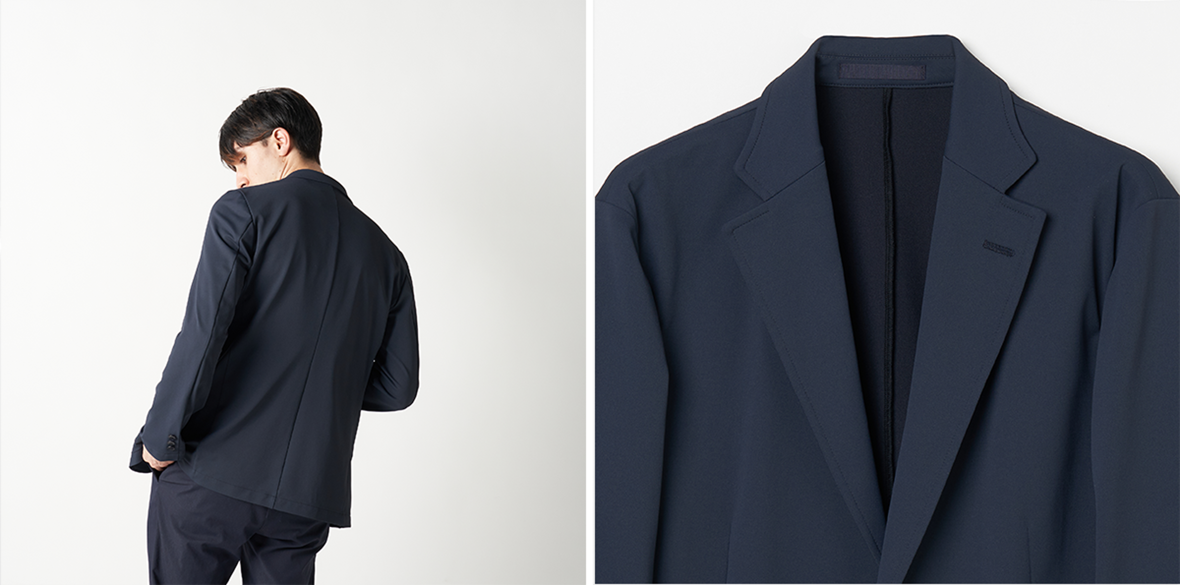胸ポケットやベント、内ポケットを省くことでクリーンなルックスに仕上がっており、さらには軽量化も実現しています。