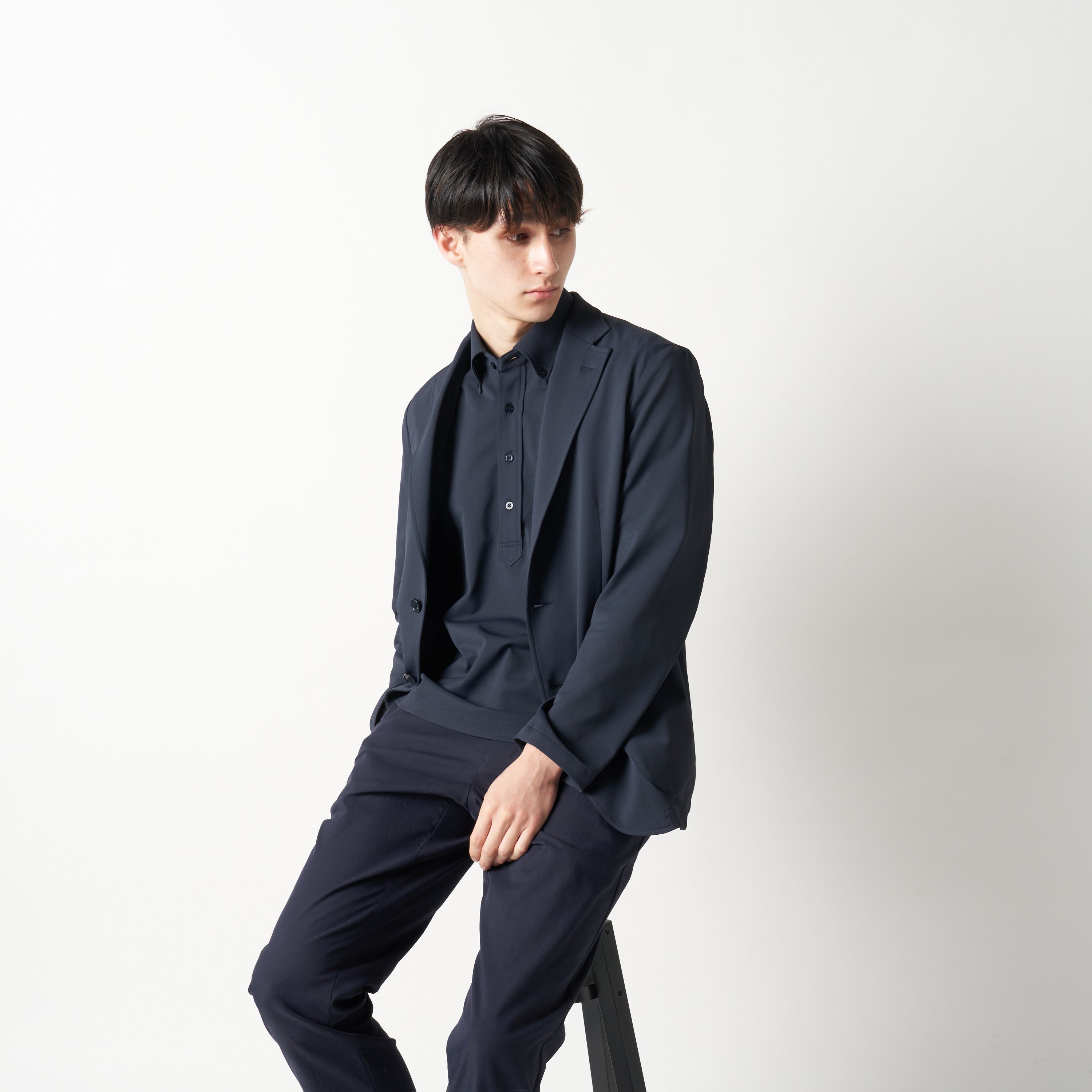 ジャケットを着用するとシャツを着ているかのように見えるので、カジュアルなイメージの強いプルオーバータイプでもきちんとした印象に。