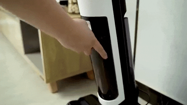 専用充電台に戻しボタンを押すと約90秒のモップ自動洗浄が開始します。