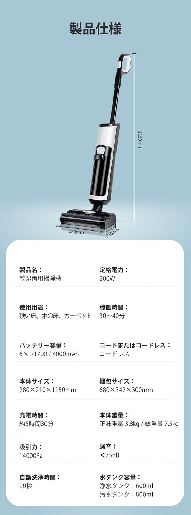 IZELL-X8は吸引、水拭き、を同時に行う事ができます。