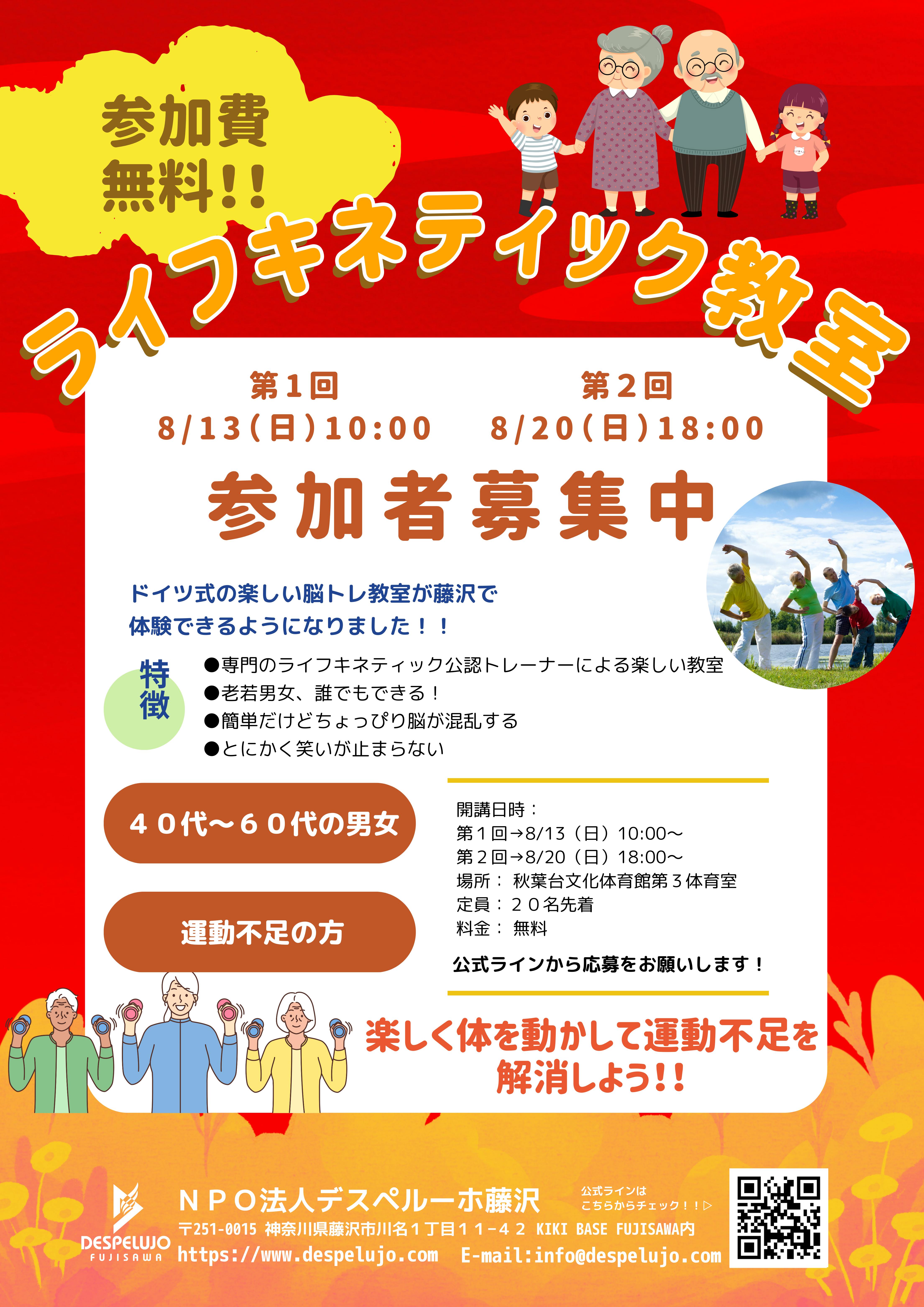 2023/07/19 11:51皆様、ご無沙汰しております。デスペルーホ藤沢 タイヨウです!この度、ライフキネティック教室の第1回、2回の開催日時が決定しました!以下開催のお知らせになります。ーーーーーーーーーーーーーこれでアナタも脱ナマケモノ・子ども〜おじいちゃんまで誰でも出来る・簡単だけどちょっぴり脳が混乱する・とにかく笑いが止まらないこんな運動教室あったらやってみたくなりませんか?なんと!!このドイツ式の楽しい脳トレ教室が藤沢で体験できることになりました!いまなら①参加費→無料②参加賞として景品が貰えるチャンス③運動不足解消一石三鳥のイベントです!!開講日時: 第1回→8/13(日)10:00〜第2回→8/20(日)18:00〜場所: 秋葉台文化体育館第3体育室定員:20名先着料金: 無料※20名限定の先着順となりますのでいますぐLINEをチェックして応募してください!https://lin.ee/LcBeImBーーーーーーーーーーーーー以上、お知らせでした!皆様からご支援をいただきまして、開催まであと少しのところまできました!8月から計6回の開催を予定しておりますので、ご支援者の皆様もご予定が会いましたらぜひご参加ください!リターン品も絶賛発送中でございます!ご到着までもうしばらくお待ちください。暑い日が続いておりますが、熱中症にお気をつけてお過ごしください。 もっと見る目標金額達成!! そして次のスタートへ!!