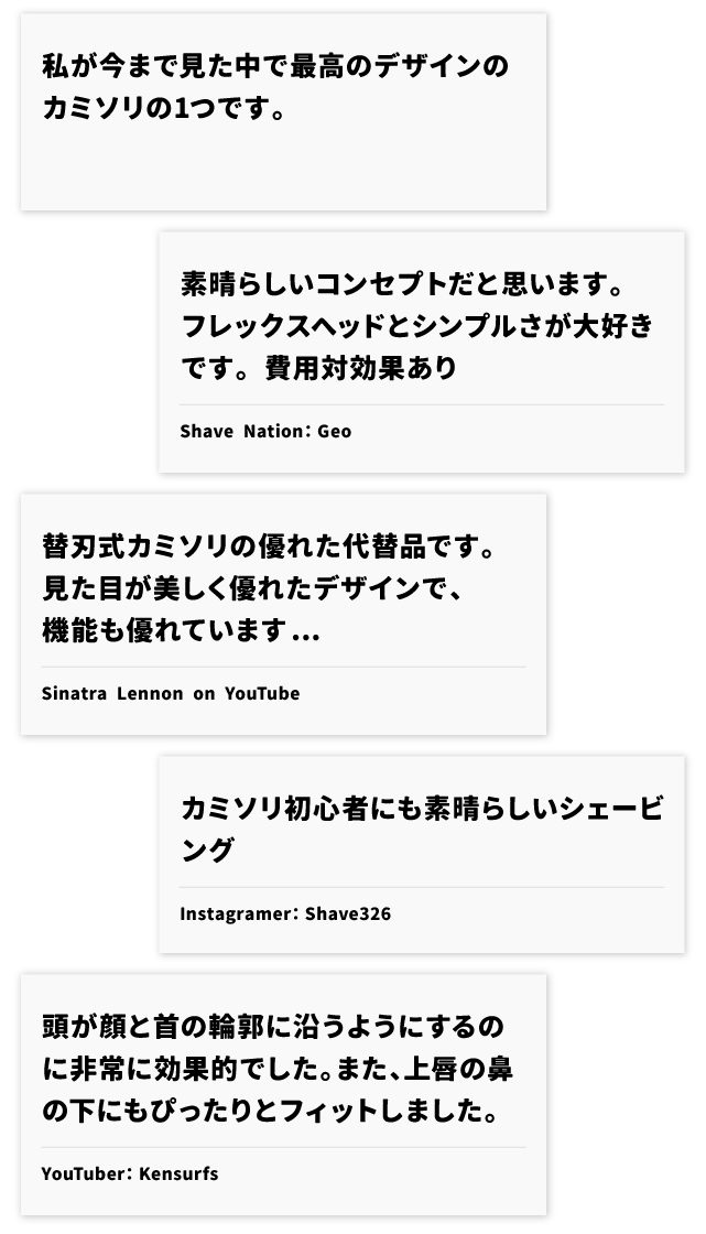 2023/06/25 13:16シェーバーを受け取られたお客様より嬉しいコメントを頂きました。貴重なご意見ありがとうございます。是非、皆さま、コメントやお写真を頂けると励みになります。info@sangotrading.comまた、購入者向けにお知らせしました日本未発売のインスタキャンペーンのポーチの写真を添付します。色はこちらにお任せとなります。こちらでは一枚しか添付出来ないのでインスタでご覧くださいませ。https://www.instagram.com/highproof_razor_japan/シェーバーは、近日、Makuakeストアにて販売を開始したいと思っております。↓↓↓クラウドファンディングのサイトで一目惚れした一枚刃カミソリを使っています。一枚刃は皮膚を痛めてカミソリ負けが出来るので苦手でしたが、一枚刃でも綺麗に剃れるらしいと知り、思いきって購入。ネットで調べ、改めて髭の剃り方を学びなおし「髭を温めて柔らかくする」「皮膚に押し付けない」など、面倒臭がらず、基本的なことをして剃ったらヒリヒリせずに剃る事が出来ました。 もっと見る配送について
