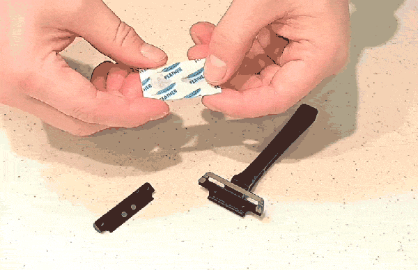 お届けの際はフェザー社のステンレス両刃が5枚付きます。下記動画のように紙につつまれた状態で半分に折り、1枚ずつ使用してください。
