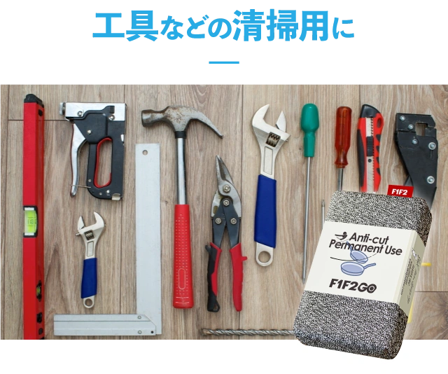 汚れた工具を洗うスポンジとしてもF1F2GOは最適です。 鋭利な部分に対して、強靭な特殊繊維が活躍すること間違いなしです。
