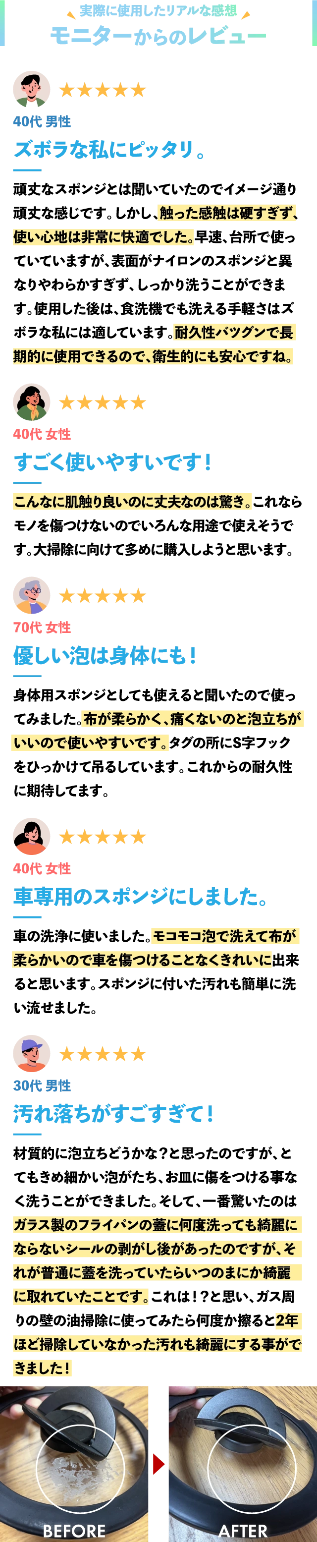結果はページでご覧の通りです。汚れ落とし、泡立ち、耐久性抜群のこのスポンジが、みなさまの日常の作業をスムーズにするお手伝いができますように。