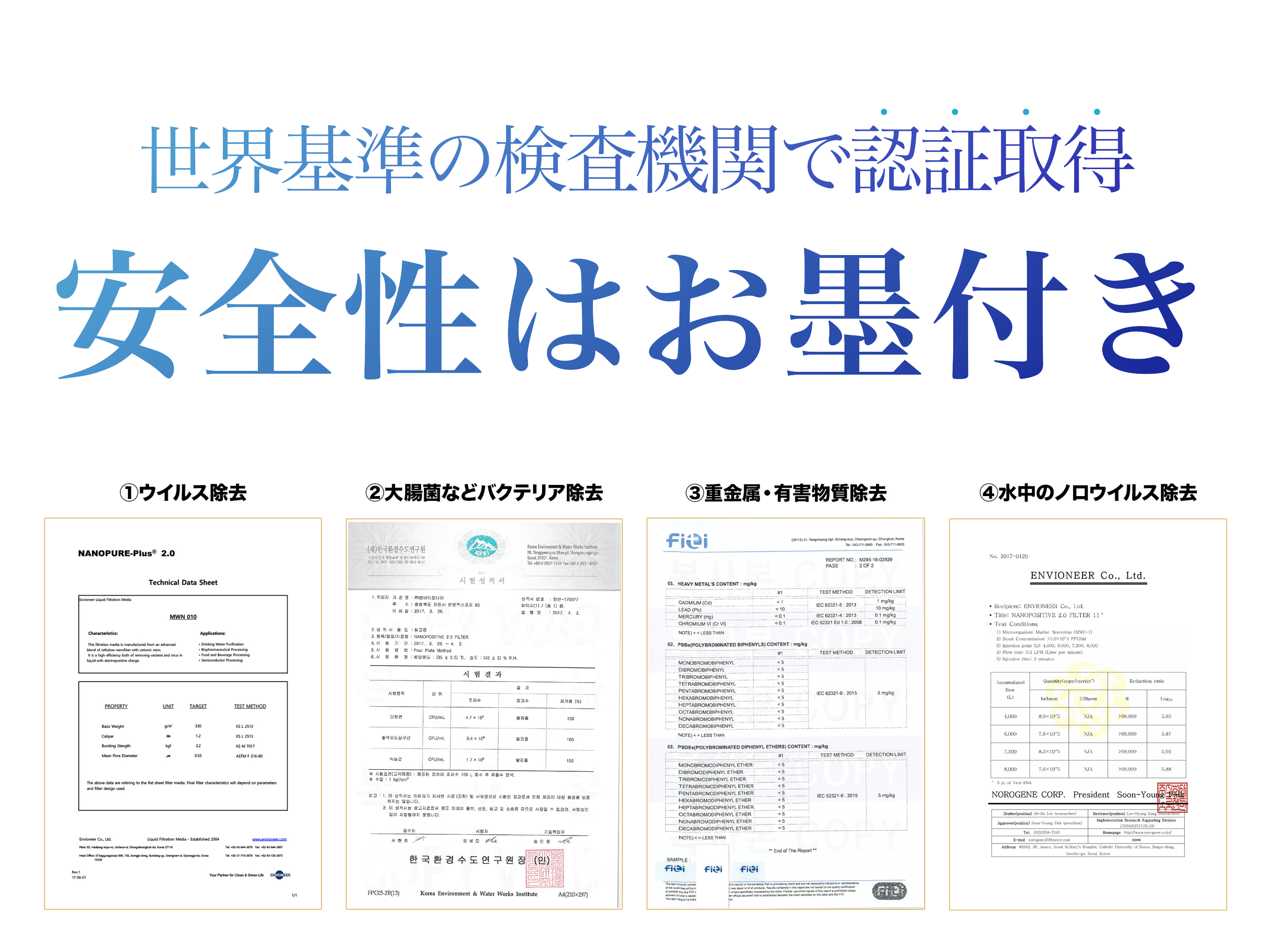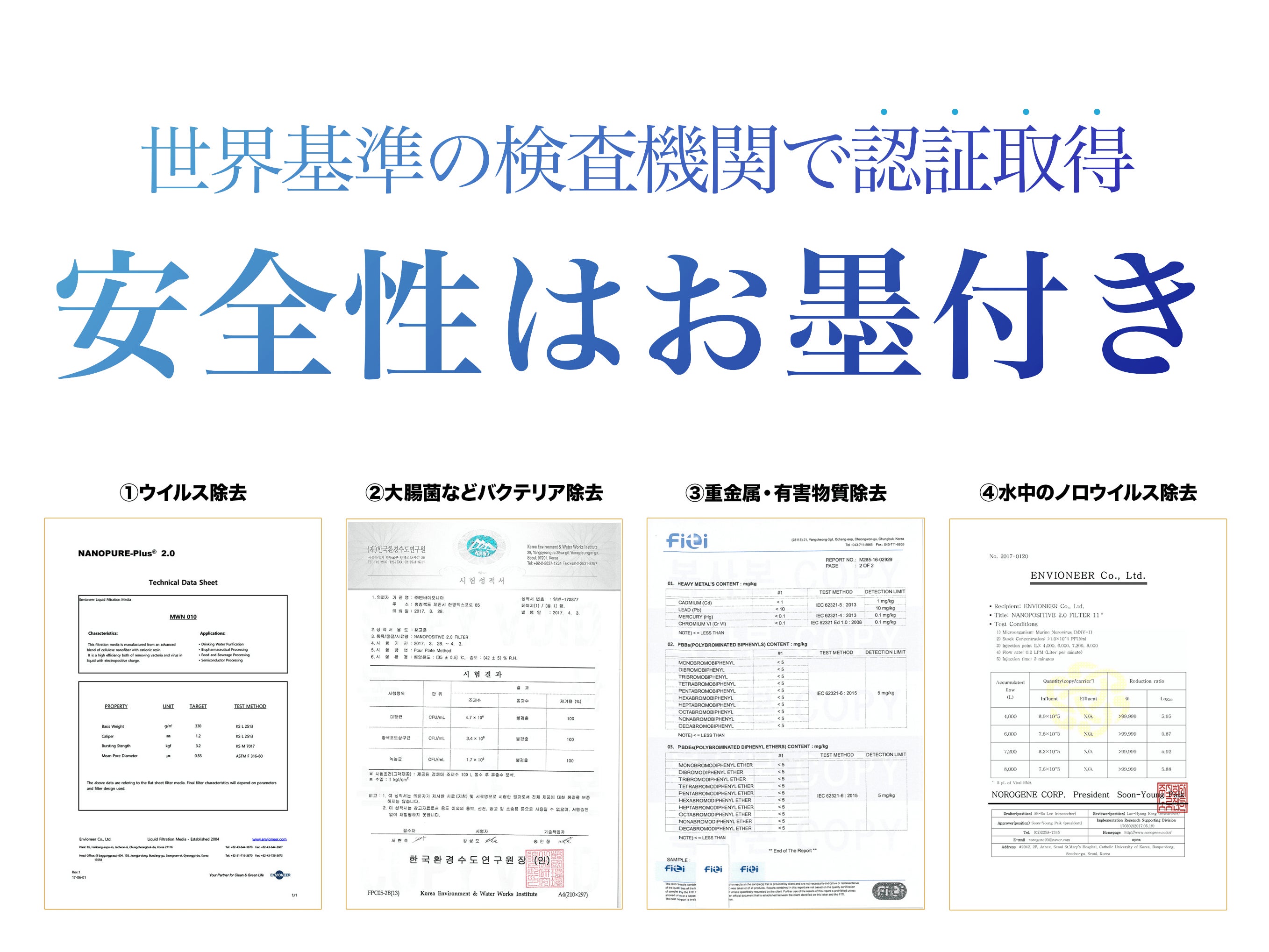 RIPURIのフィルターは、世界基準の検査機関でもウイルスやバクテリアを除去できることが確認されています。