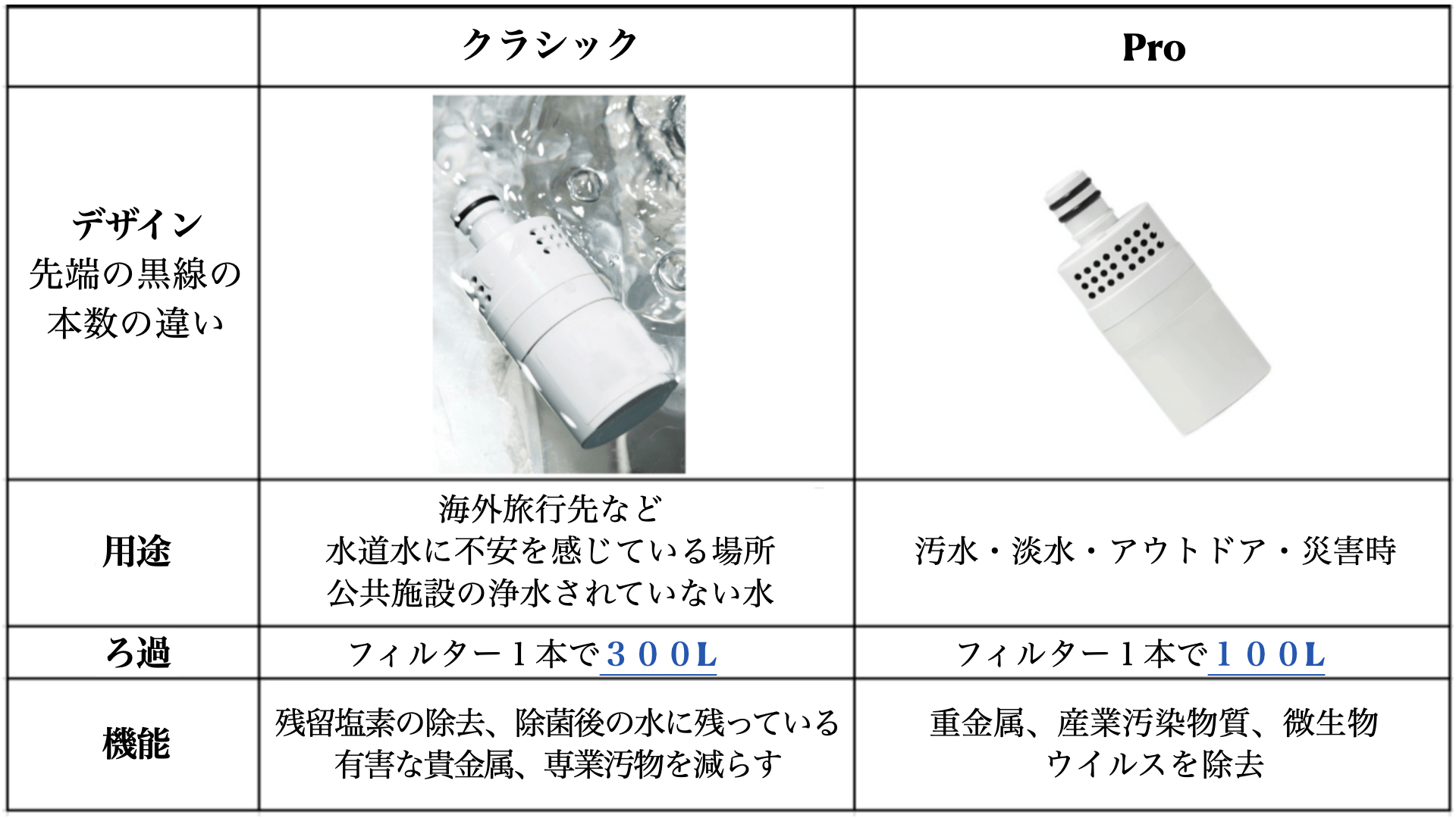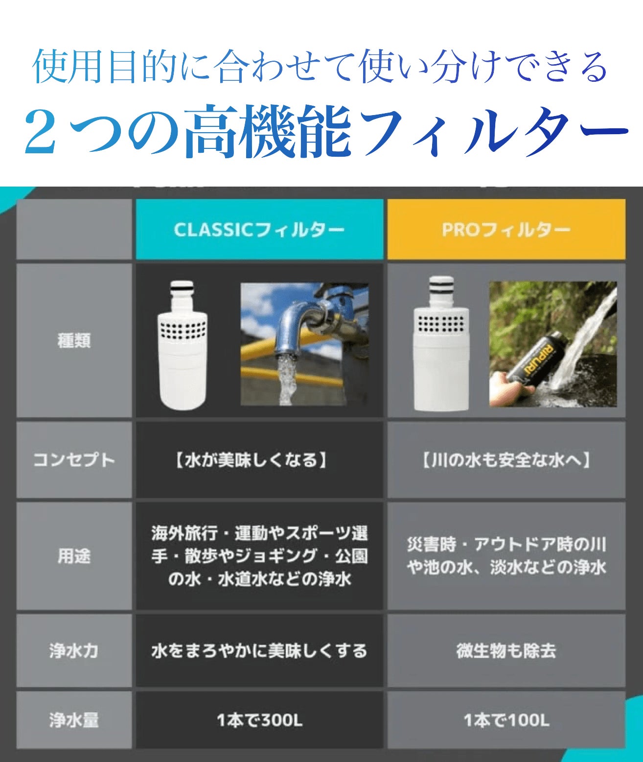雨水や汚水を浄化するときはProフィルター、水道水を浄化するときはクラシックフィルターをつけてください。