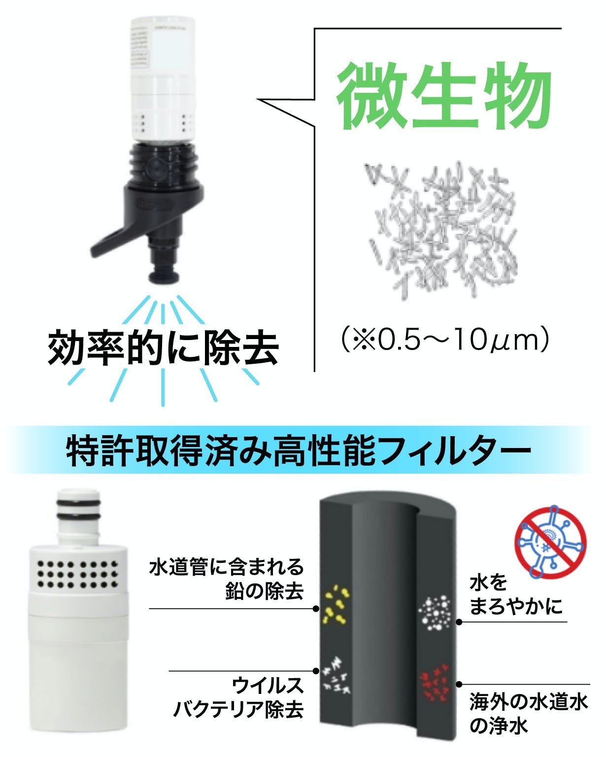 二重構造で作られた強力な浄水フィルターが、水中のウイルスや微生物、ヒソや水銀などの有機金属を99.9%除去。