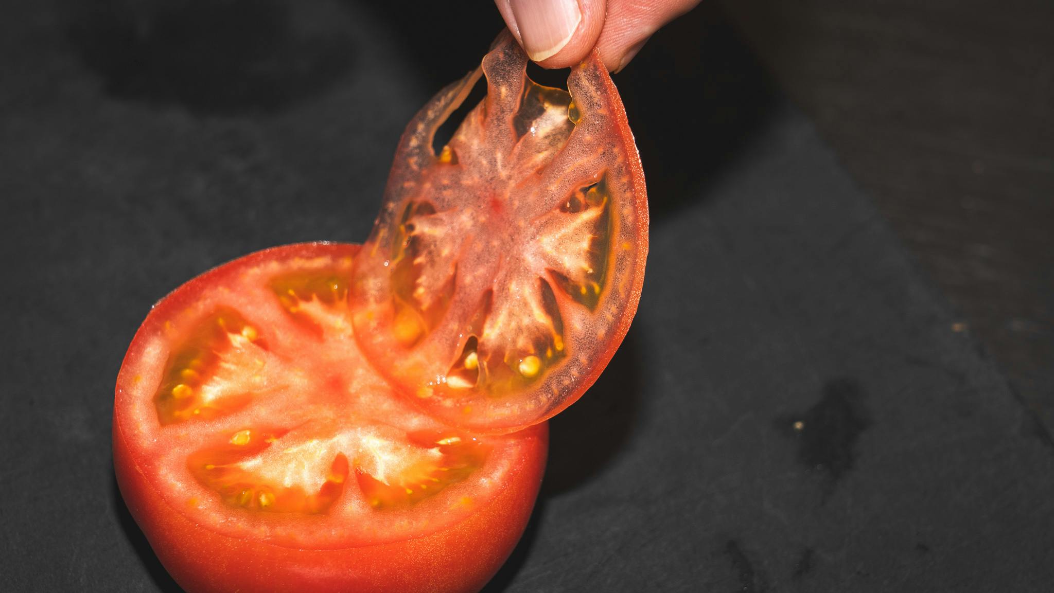切れ味の良い包丁で切ったトマトは、断面がざらざらしていなくて、味わいがクリアです。