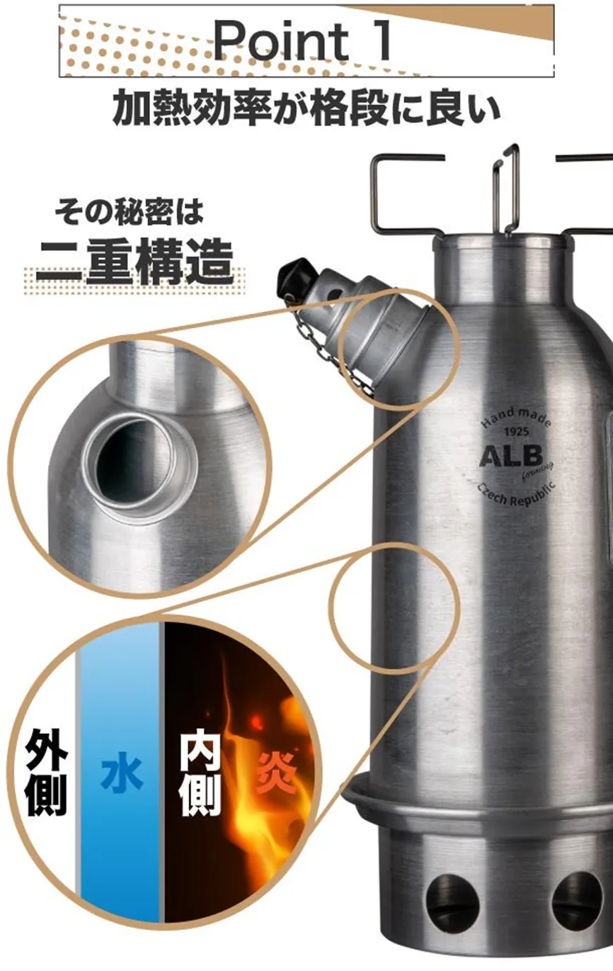 外壁と内壁の間に水を注ぎ、空洞となった内側に火を焚くことで、内側全体から加熱可能です。