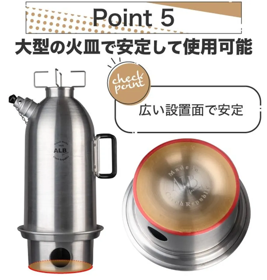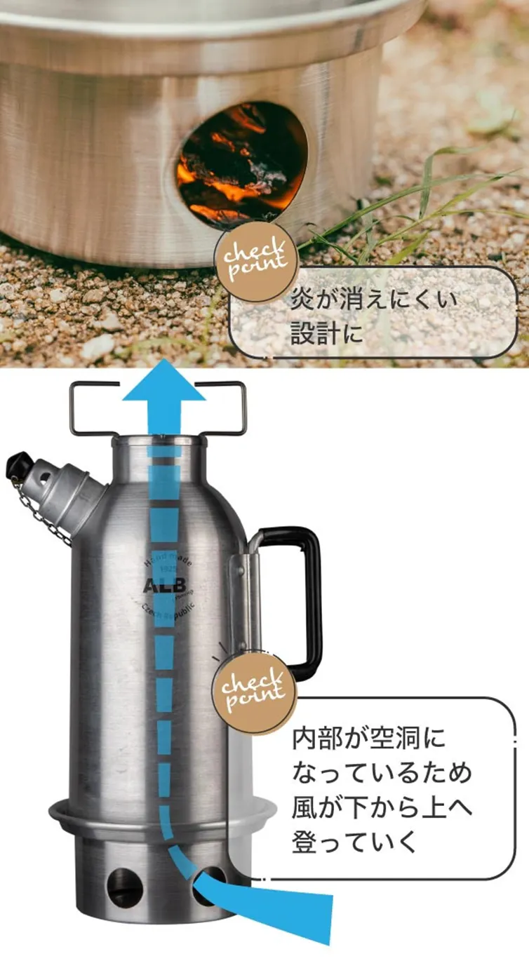 サモワールは炎が消えにくい設計となっています。また、本体下部から上部に向かって風が抜けるようになっているため、炎の勢いが増して消えにくくなっています。
