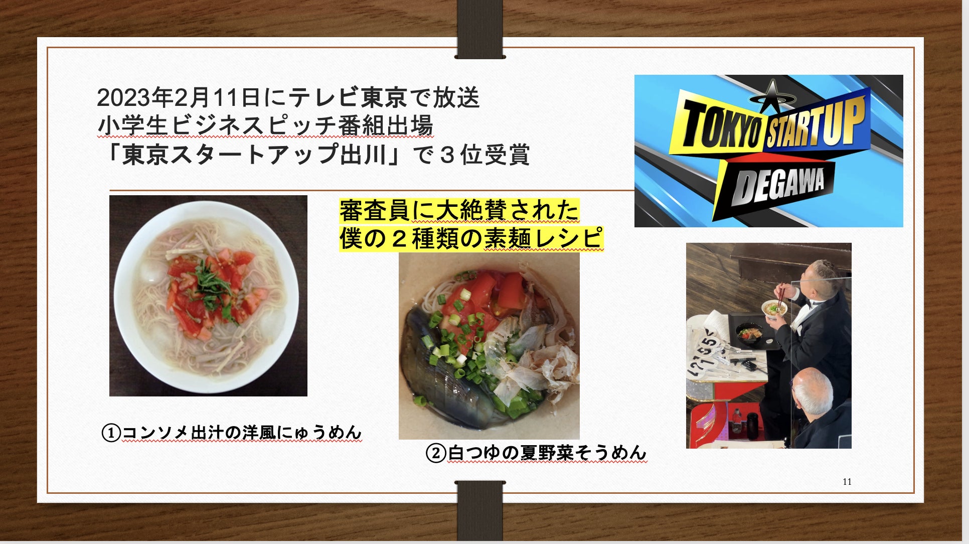 2023年2月11日に放送されたテレビ東京「スタートアップDEGAWA」という小学生のビジネスピッチ番組に出場し、ぼくのそうめん「コンソメにゅうめん」「夏野菜のそうめん」の2種類を審査員に食べてもらい、とてもおいしいと完食してくれました。