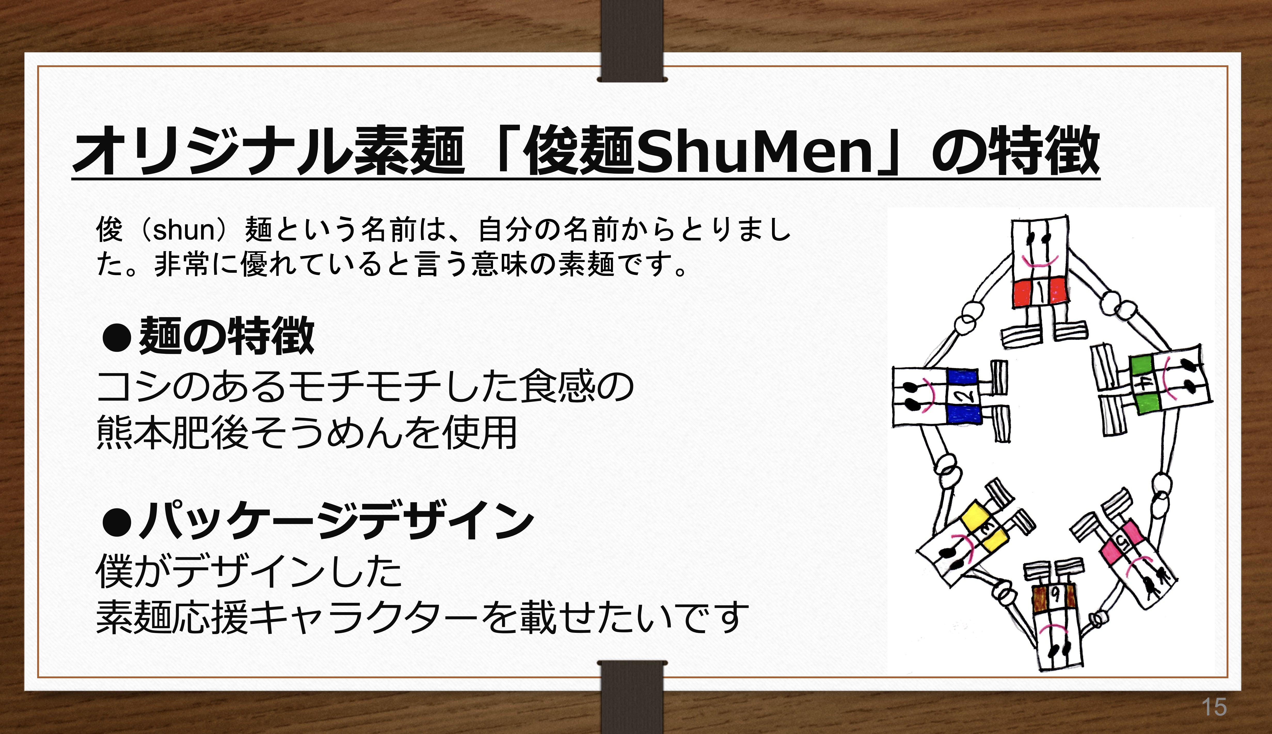 俊麺の特徴は、コシのあるモチモチした食感の熊本肥後そうめんを使用しパッケージと素麺応援キャラクターは自分で考えました。