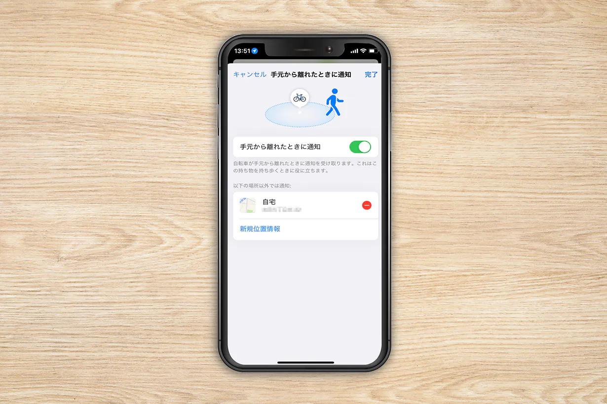 ORBIT VELOがiPhoneから一定距離、離れるとスマホの通知機能でお知らせが届きます。