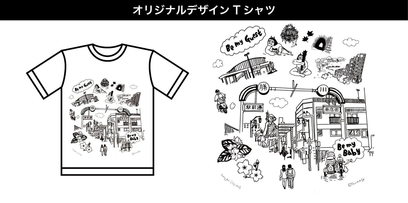 ・映画と春日井の街を描いたオリジナルデザインTシャツ(サイズをS,M,Lからお選びください。色は白地に黒色プリントのみです。)
