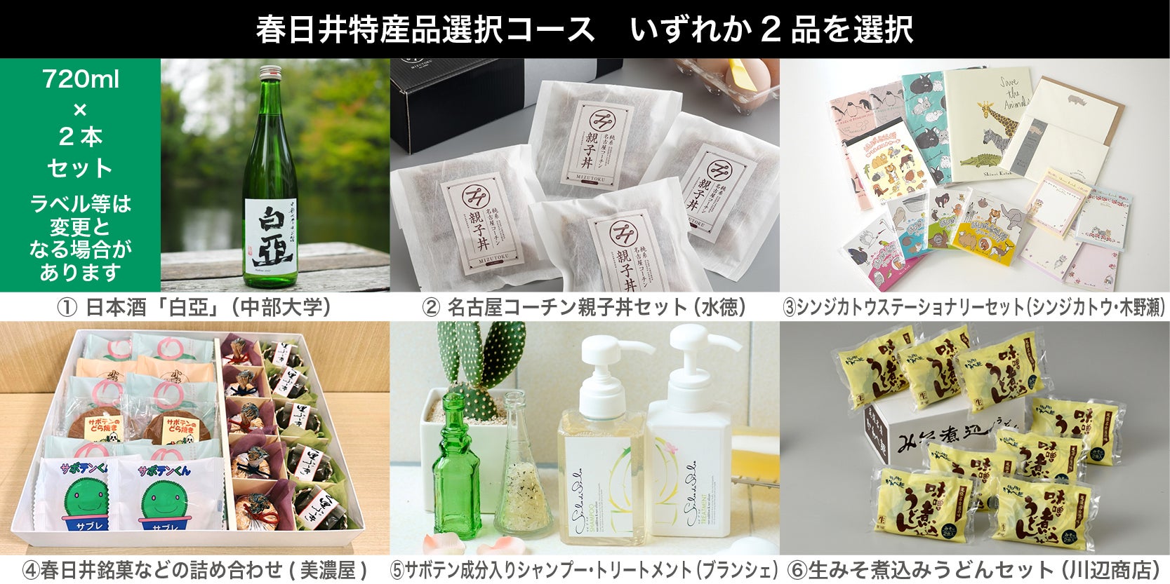次の春日井の特産品6品の中から2つをお選びください。同じ商品の選択も可能です。