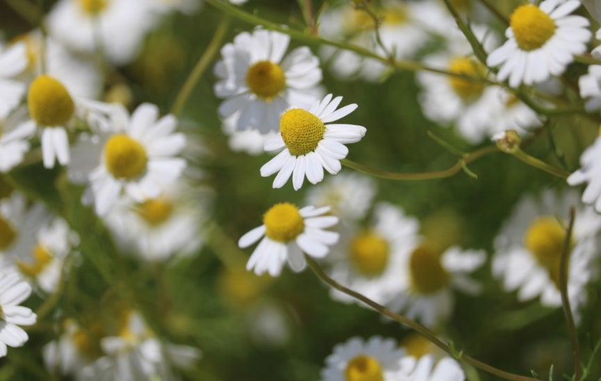 カモミールはヨーロッパでは「母の薬草」と言われ、体内の平滑筋を落ち着かせる効果があると言われ腹痛、生理痛などを和らげる効果があり、アズレン誘導体という成分が胃の粘膜を修復する作用があり、他にも冷え性や花粉症、化粧水として肌にもいいとされています。