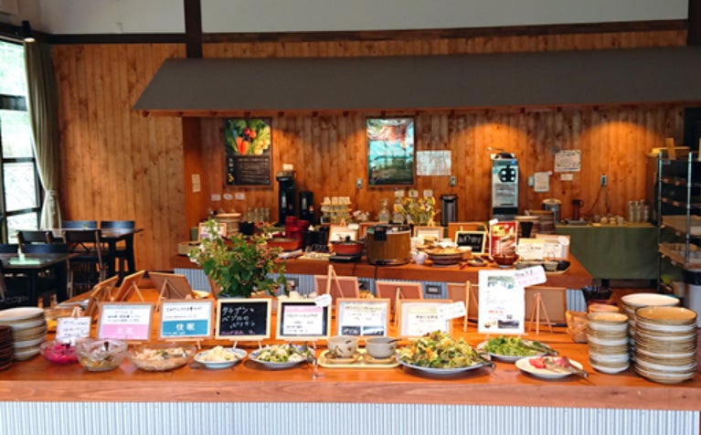 2016年には廃園となった幼稚園を改装した農家レストラン「且緩々(しゃかんかん)」を開業。四方を囲む自然を眺めながら、地元の農家のみなさんが作る旬の食材をふんだんに使った料理を提供しています。