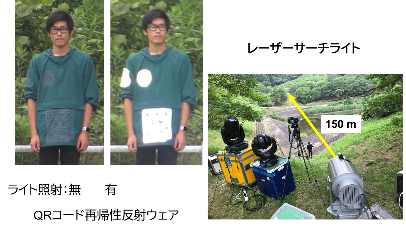 その後、本システムを山岳遭難者の捜索に利用できることがわかり、QRコード再帰性反射材をプリントしたウェアを開発し、下記のサーチライト搭載ドローンを用いた光探索システムの専用ソフトも開発しました。