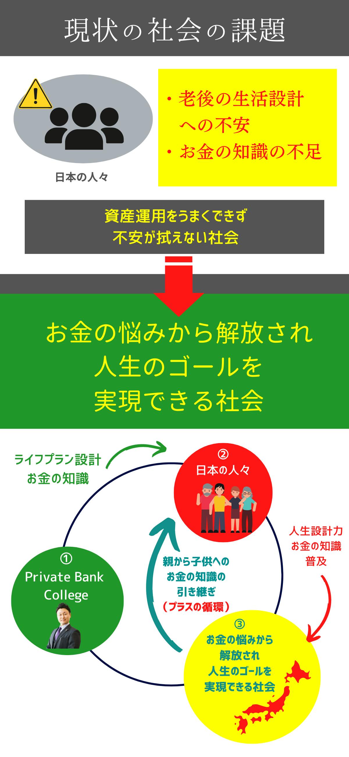 そこで私は、この状況を打破していくためにPrivate Bank Collegeを運営しております。「お金の悩みから解放され、人生のゴールを実現できる社会」を実現していきたいと思い、クラウドファンディングプロジェクトを立ち上げました!