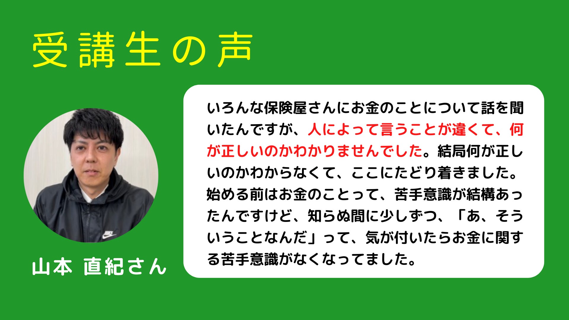 受講後は、保険の営業マンと対等に話し合うことができますし、たくさんの金融商品の中からご自身にとって適切な金融商品を選ぶことができます。払いすぎていた保険料・投資金額を見直すこともできるようになります。