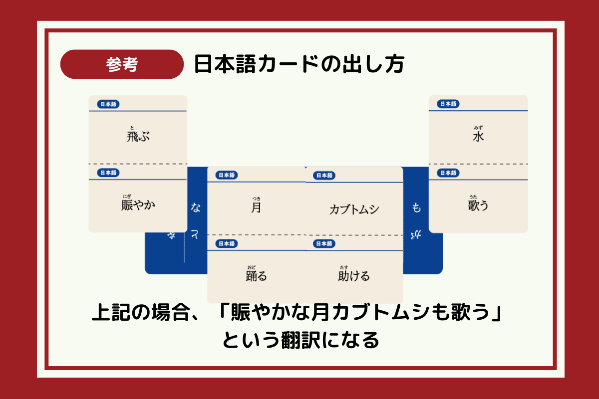 山札から「英文カード」と「日本語カード」を1枚引き、場にオープンします。ここで引いた英文カードが 今回日本語に翻訳するお題です。また、オープンされた日本語カードは必ず翻訳に使用しなければなりません。