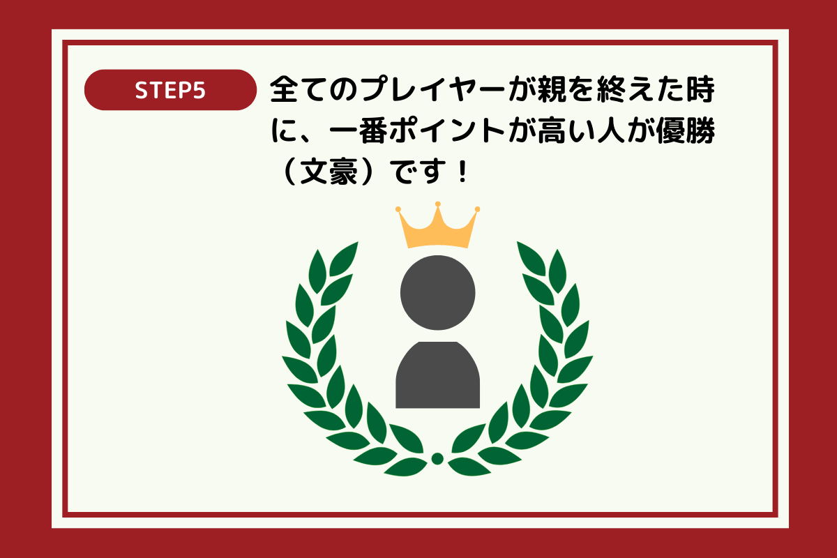 STEP1~4を繰り返していき、すべてのプレイヤーが親のターンを完了したら、ゲーム終了です。合計ポイントの最も多いプレイヤーの勝利となります。