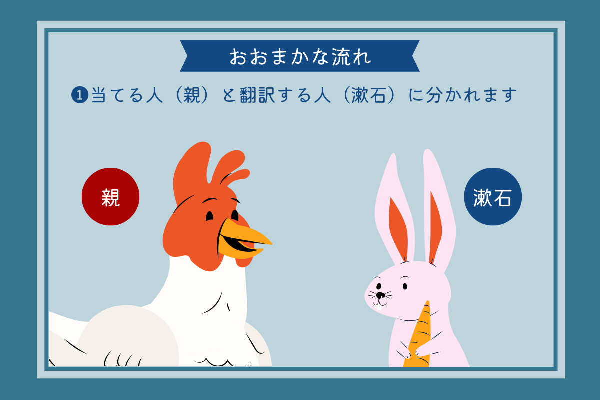 親の左隣の人から時計回りに、漱石はそれぞれの訳を発表します。 親は全員の翻訳を聞いた後、お題の英文カードを予想します。
