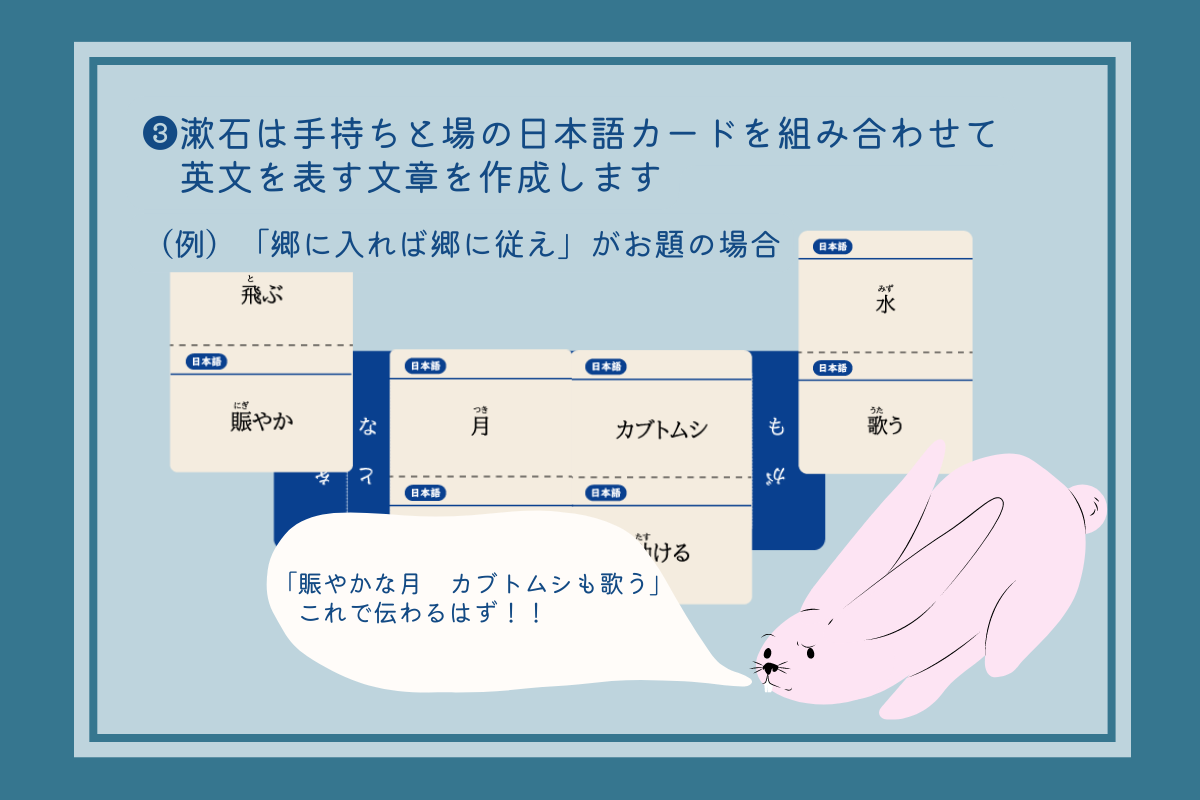 漱石はそれぞれ手札の日本語カードと場の日本語カードを使い、お題の英文カードの翻訳を考えます。