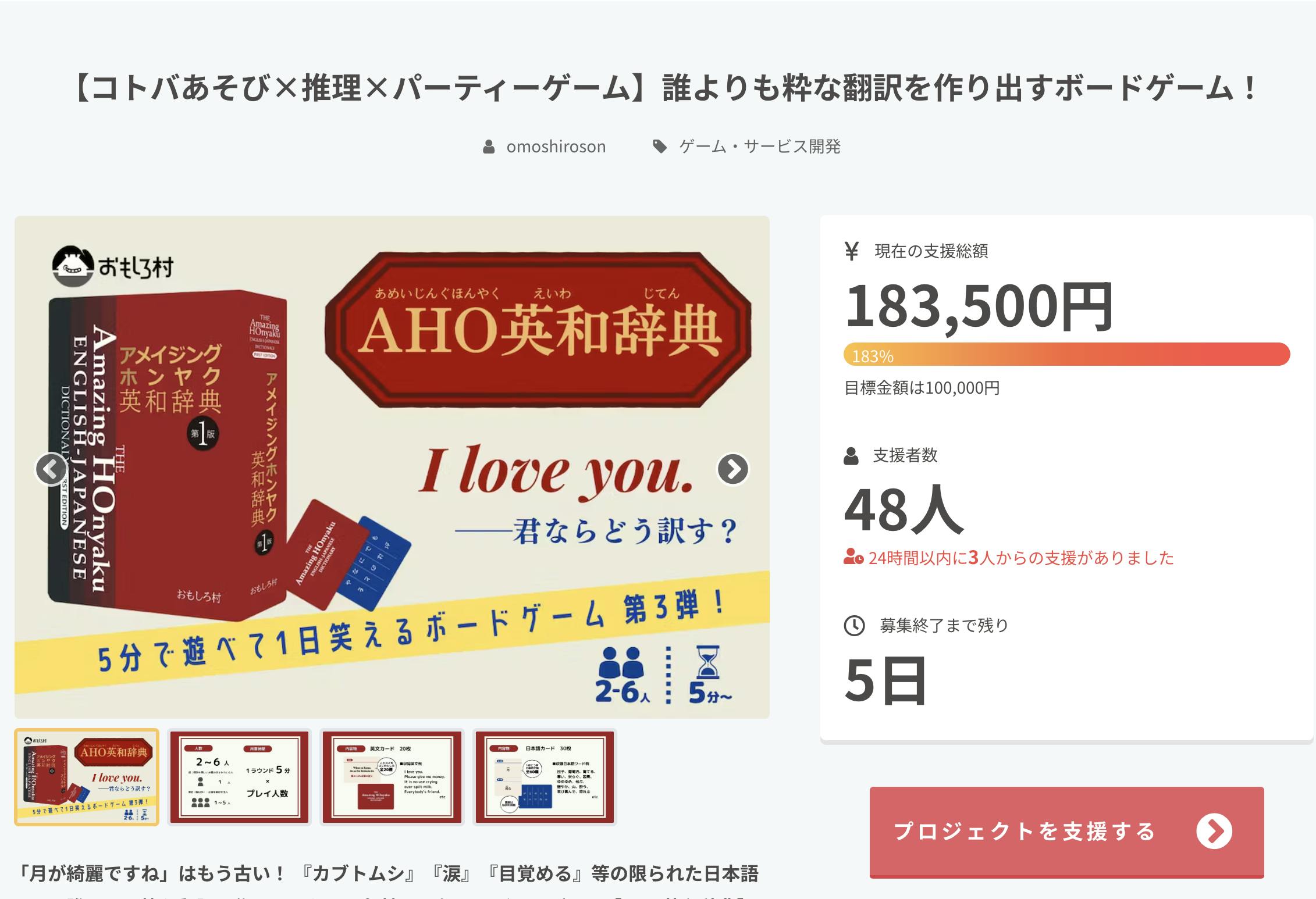 2023/05/02 05:28おもしろ村新作【AHO英和辞典】なんと1週間で目標を達成し、現在では達成率183%まできています!!メンバー一同驚きを隠せません。ご支援いただきました皆様本当にありがとうございます!支援期間も残すところあと5日!!5月7日まで走り抜けたいと思います。引き続きどうぞよろしくお願いします!! もっと見る