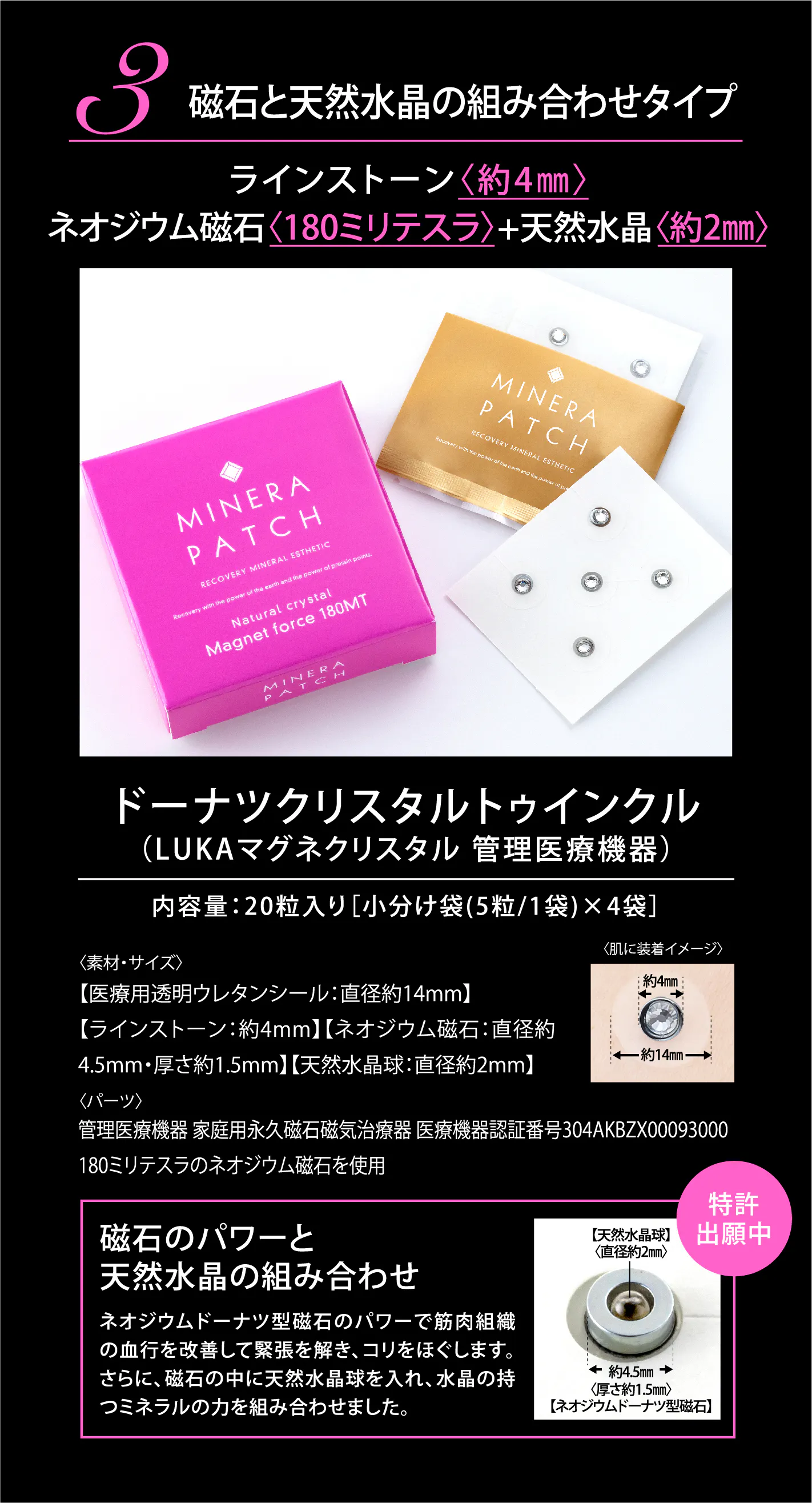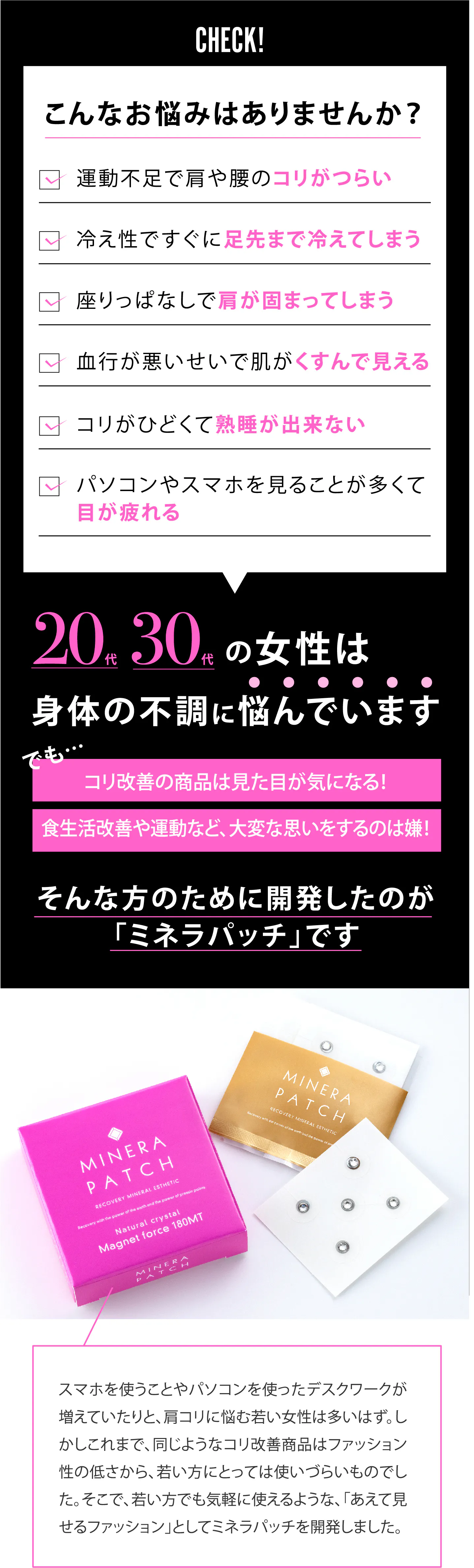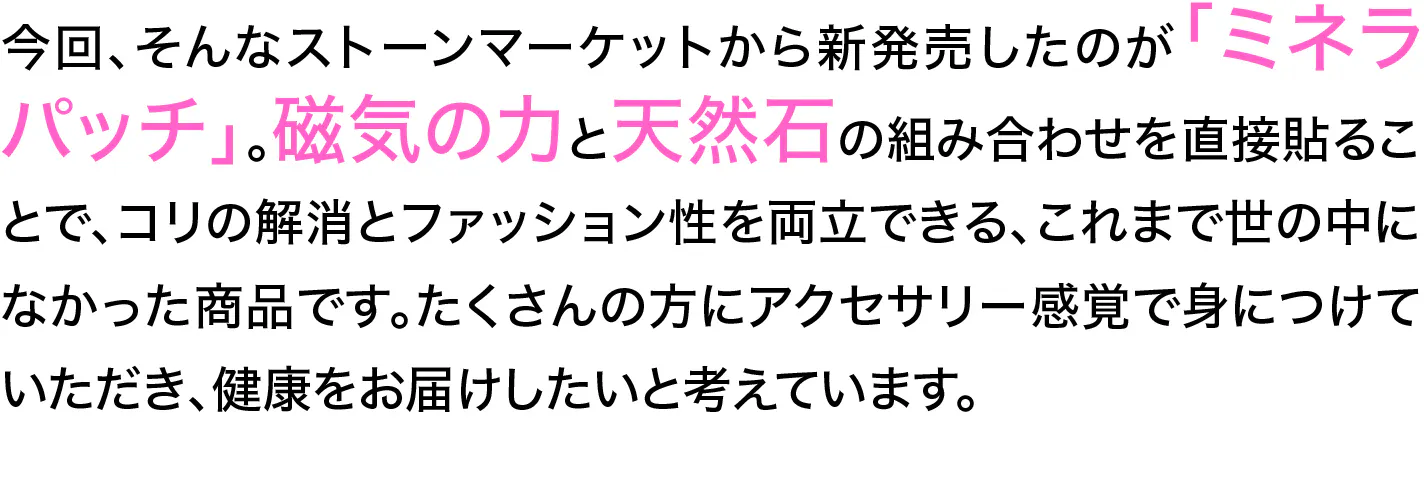 創業28 周年を迎えたストーンマーケットが、この度、健康にもファッション性にもこだわった待望の新商品『MINERA PATCH(ミネラパッチ)』を販売します。『MINERA PATCH』は磁気と天然石を組み合わせた磁気治療器で、素肌に直接貼るだけで首や肩のコリや血行不良など、多くの女性が抱えるトラブルへの解消が見込めます。